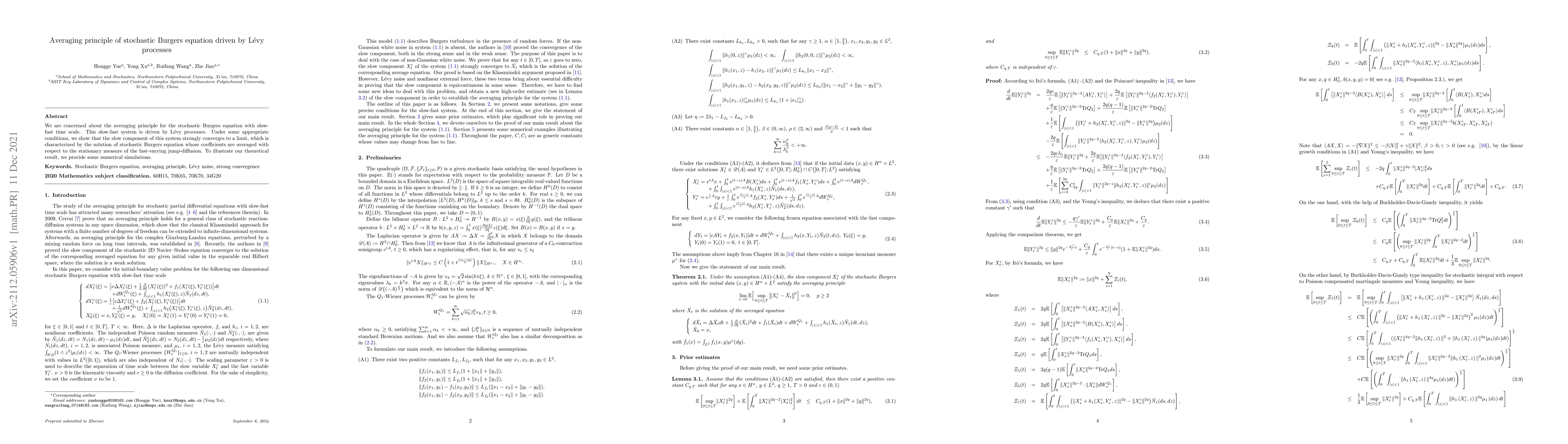 This paper investigates the averaging principle for a stochastic Burgers equation driven by Lévy processes, demonstrating that the slow component converges strongly to a limit defined by an averaged stochastic Burgers equation. Numerical simulations support the theoretical findings.