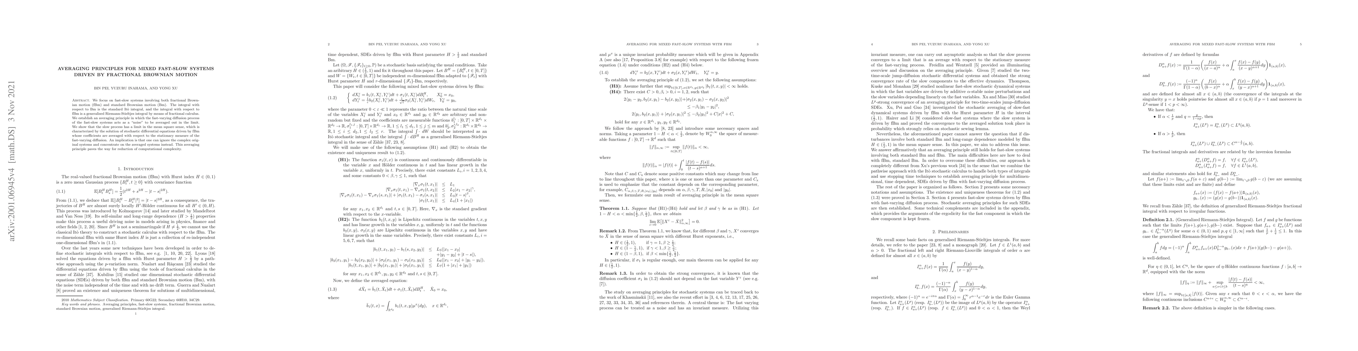 We focus on fast-slow systems involving both fractional Brownian motion (fBm) and standard Brownian motion (Bm). The integral with respect to Bm is the standard Ito integral, and the integral with respect to fBm is the generalised Riemann-Stieltjes integral using the tools of fractional calculus. An averaging principle in which the fast-varying diffusion process of the fast-slow systems acts as a noise to be averaged out in the limit is established. It is shown that the slow process has a limit in the mean square sense, which is characterized by the solution of stochastic differential equations driven by fBm whose coefficients are averaged with respect to the stationary measure of the fast-varying diffusion. The implication is that one can ignore the complex original systems and concentrate on the averaged systems instead. This averaging principle paves the way for reduction of computational complexity.