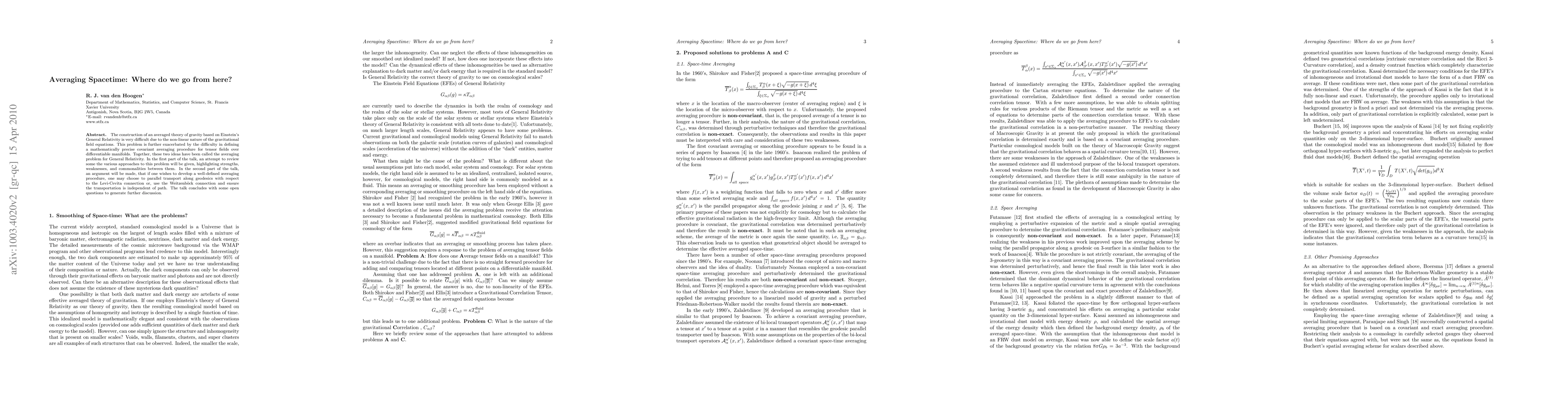 The construction of an averaged theory of gravity based on Einstein's General Relativity is very difficult due to the non-linear nature of the gravitational field equations. This problem is further exacerbated by the difficulty in defining a mathematically precise covariant averaging procedure for tensor fields over differentiable manifolds. Together, these two ideas have been called the averaging problem for General Relativity. In the first part of the talk, an attempt to review some the various approaches to this problem will be given, highlighting strengths, weaknesses, and commonalities between them. In the second part of the talk, an argument will be made, that if one wishes to develop a well-defined averaging procedure, one may choose to parallel transport along geodesics with respect to the Levi-Cevita connection or, use the Weitzenb\"ock connection and ensure the transportation is independent of path. The talk concludes with some open questions to generate further discussion.