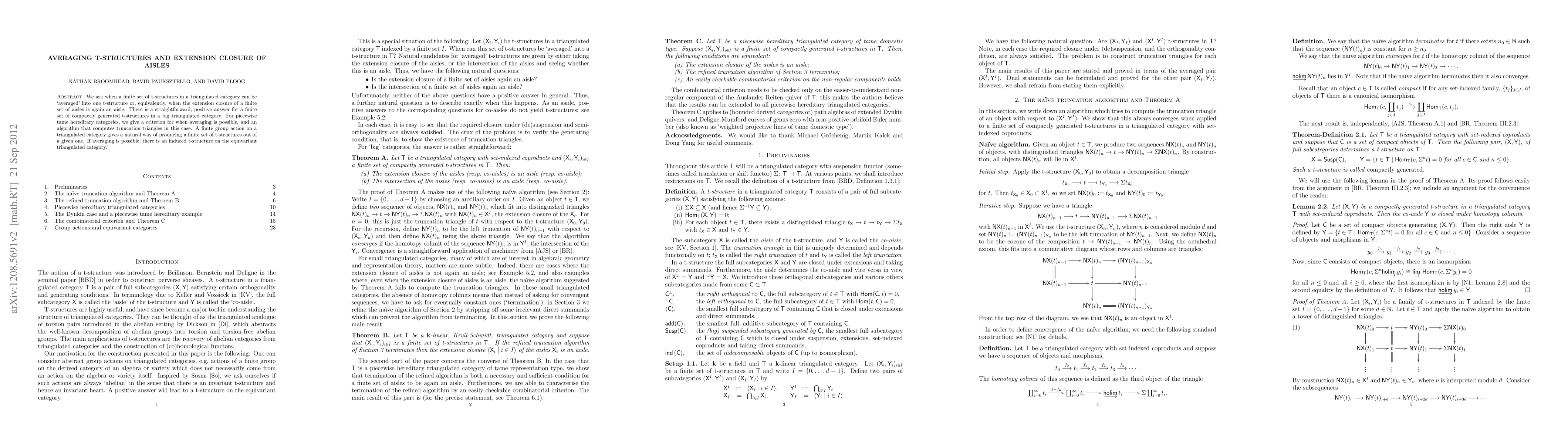 Summary: This paper investigates conditions under which a finite set of t-structures in a triangulated category can be averaged into a single t-structure. It provides a positive result for compactly generated t-structures in big triangulated categories and offers a criterion and algorithm for piecewise tame hereditary categories. It also explores the impact of finite group actions on the averaging process and induced t-structures in equivariant categories.