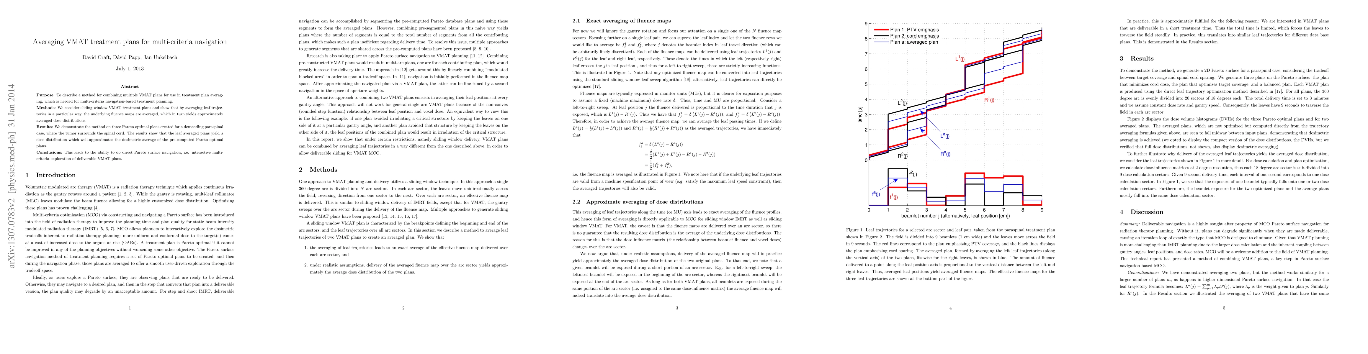 This paper discusses a method to combine two or more volumetric modulated arc therapy (VMAT) plans by averaging leaf positions, resulting in dose distributions that approximate the average of the original plans. This technique enables Pareto surface navigation for interactive exploration of dosimetric tradeoffs in VMAT treatment planning.