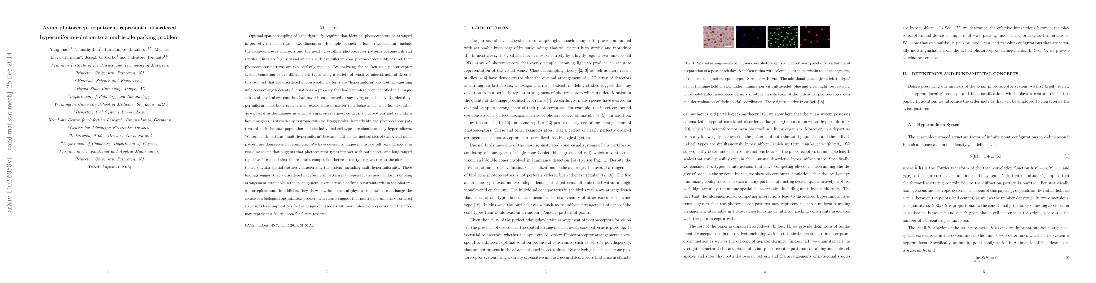 Optimal spatial sampling of light rigorously requires that identical photoreceptors be arranged in perfectly regular arrays in two dimensions. Examples of such perfect arrays in nature include the compound eyes of insects and the nearly crystalline photoreceptor patterns of some fish and reptiles. Birds are highly visual animals with five different cone photoreceptor subtypes, yet their photoreceptor patterns are not perfectly regular. By analyzing the chicken cone photoreceptor system consisting of five different cell types using a variety of sensitive microstructural descriptors, we find that the disordered photoreceptor patterns are ``hyperuniform'' (exhibiting vanishing infinite-wavelength density fluctuations), a property that had heretofore been identified in a unique subset of physical systems, but had never been observed in any living organism. Remarkably, the photoreceptor patterns of both the total population and the individual cell types are simultaneously hyperuniform. We term such patterns ``multi-hyperuniform'' because multiple distinct subsets of the overall point pattern are themselves hyperuniform. We have devised a unique multiscale cell packing model in two dimensions that suggests that photoreceptor types interact with both short- and long-ranged repulsive forces and that the resultant competition between the types gives rise to the aforementioned singular spatial features characterizing the system, including multi-hyperuniformity.