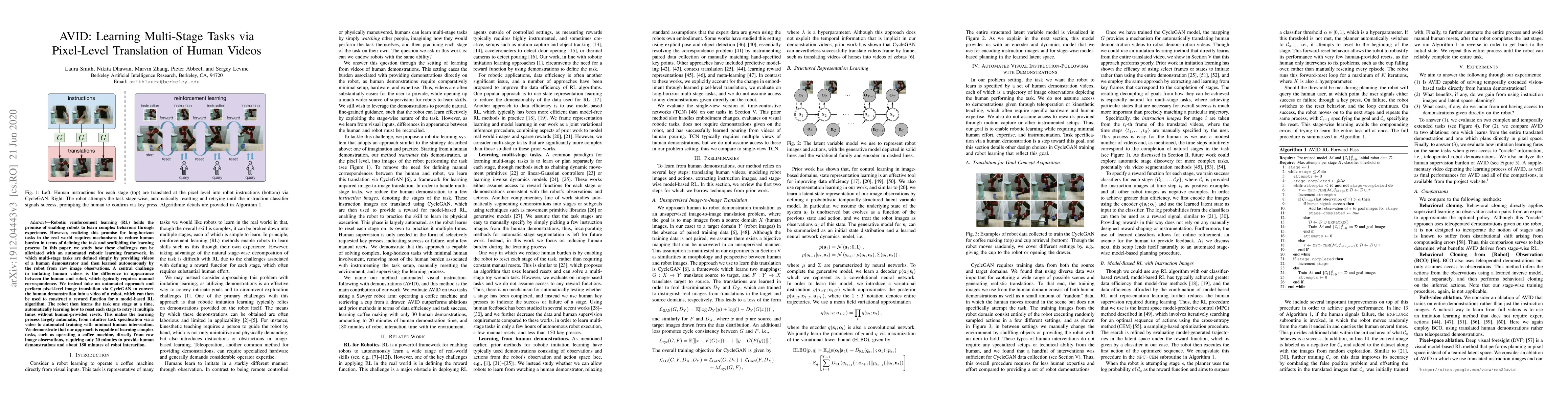 This paper proposes an automated robotic learning framework that uses pixel-level translation via CycleGAN to convert human demonstration videos into robot-specific videos, enabling model-based reinforcement learning for multi-stage tasks. The approach requires minimal human intervention, learning complex tasks like operating a coffee machine from raw images in about 180 minutes of robot interaction.