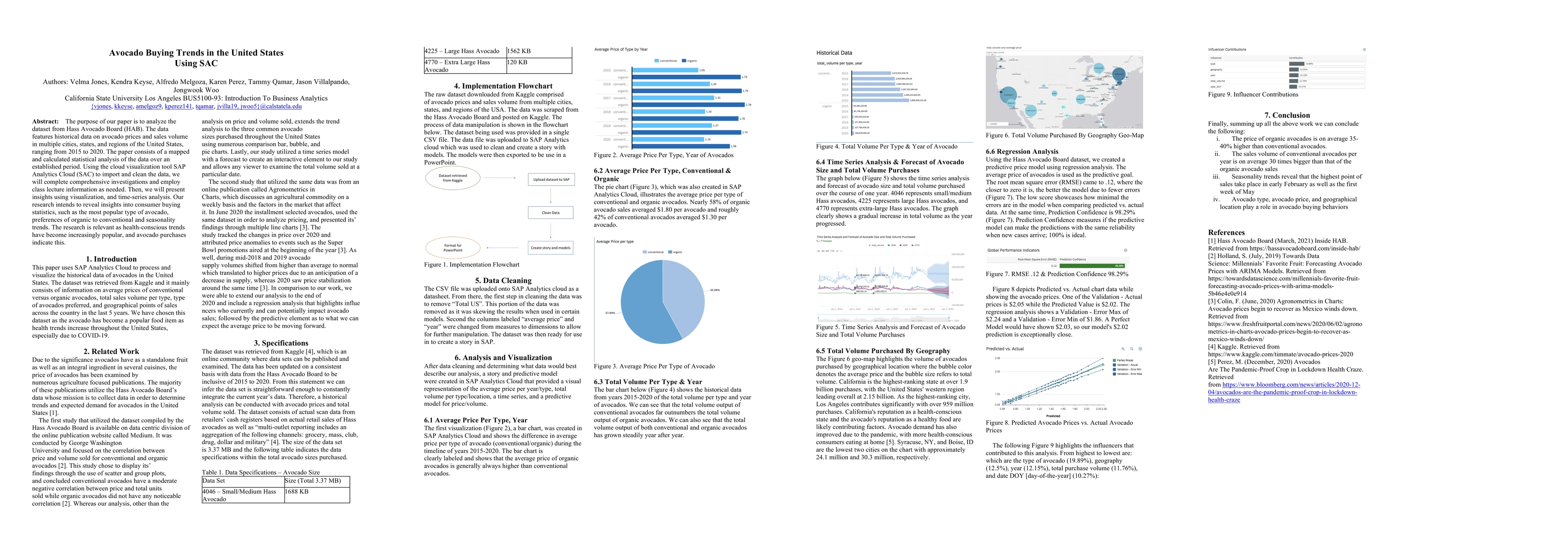 The purpose of our paper is to analyze the dataset from Hass Avocado Board (HAB). The data features historical data on avocado prices and sales volume in multiple cities, states, and regions of the United States, ranging from 2015 to 2020. The paper consists of a mapped and calculated statistical analysis of the data over an established period. Using the cloud visualization tool SAP Analytics Cloud (SAC) to import and clean the data, we will complete comprehensive investigations and employ class lecture information as needed. Then, we will present insights using visualization, and time-series analysis. Our research intends to reveal insights into consumer buying statistics, such as the most popular type of avocado, preferences of organic to conventional and seasonality trends. The research is relevant as health-conscious trends have become increasingly popular, and avocado purchases indicate this.