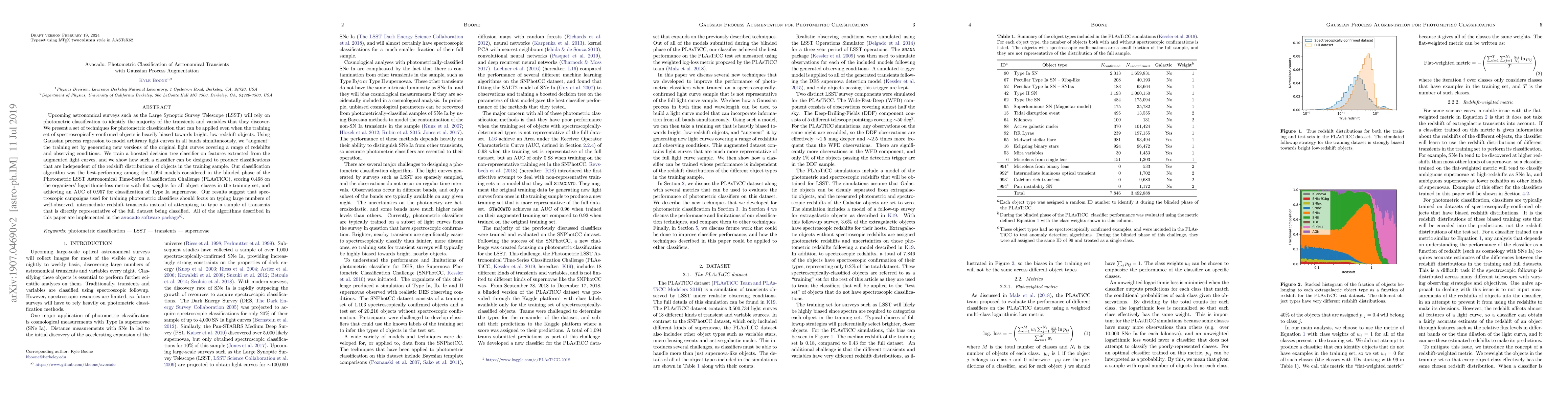 This paper presents techniques for photometric classification of astronomical transients using Gaussian process augmentation, which improves classification performance despite training data biases. The proposed method, implemented in the avocado software, outperformed other models in the PLAsTiCC challenge, suggesting that training should focus on well-observed intermediate redshift transients.