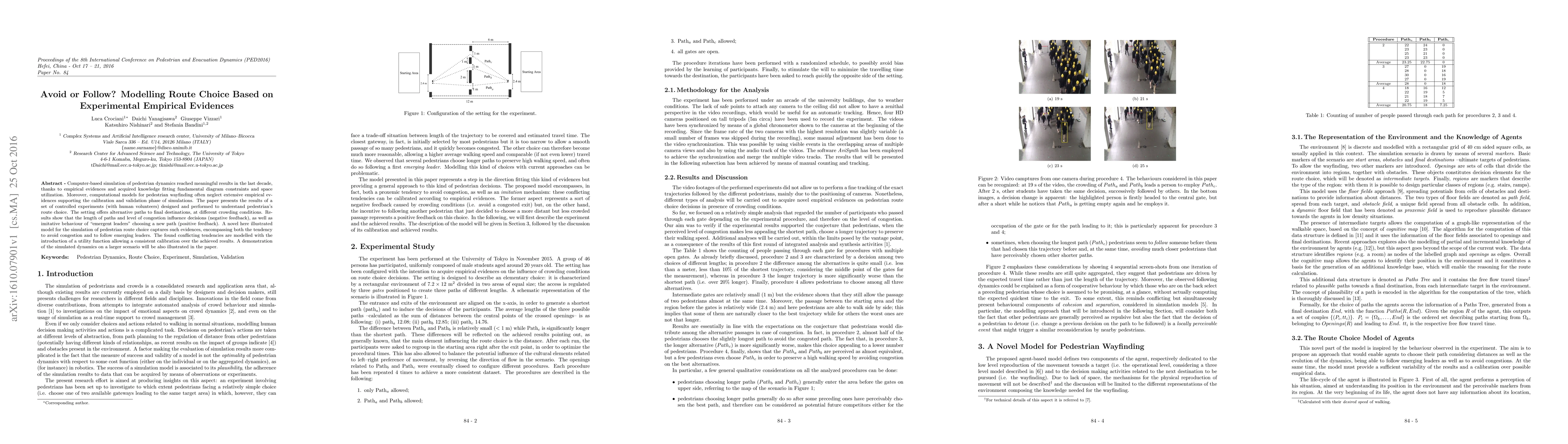 Computer-based simulation of pedestrian dynamics reached meaningful results in the last decade, thanks to empirical evidences and acquired knowledge fitting fundamental diagram constraints and space utilization. Moreover, computational models for pedestrian wayfinding often neglect extensive empirical evidences supporting the calibration and validation phase of simulations. The paper presents the results of a set of controlled experiments (with human volunteers) designed and performed to understand pedestrian's route choice. The setting offers alternative paths to final destinations, at different crowding conditions. Results show that the length of paths and level of congestion influence decisions (negative feedback), as well as imitative behaviour of "emergent leaders" choosing a new path (positive feedback). A novel here illustrated model for the simulation of pedestrian route choice captures such evidences, encompassing both the tendency to avoid congestion and to follow emerging leaders. The found conflicting tendencies are modelled with the introduction of a utility function allowing a consistent calibration over the achieved results. A demonstration of the simulated dynamics on a larger scenario will be also illustrated in the paper.