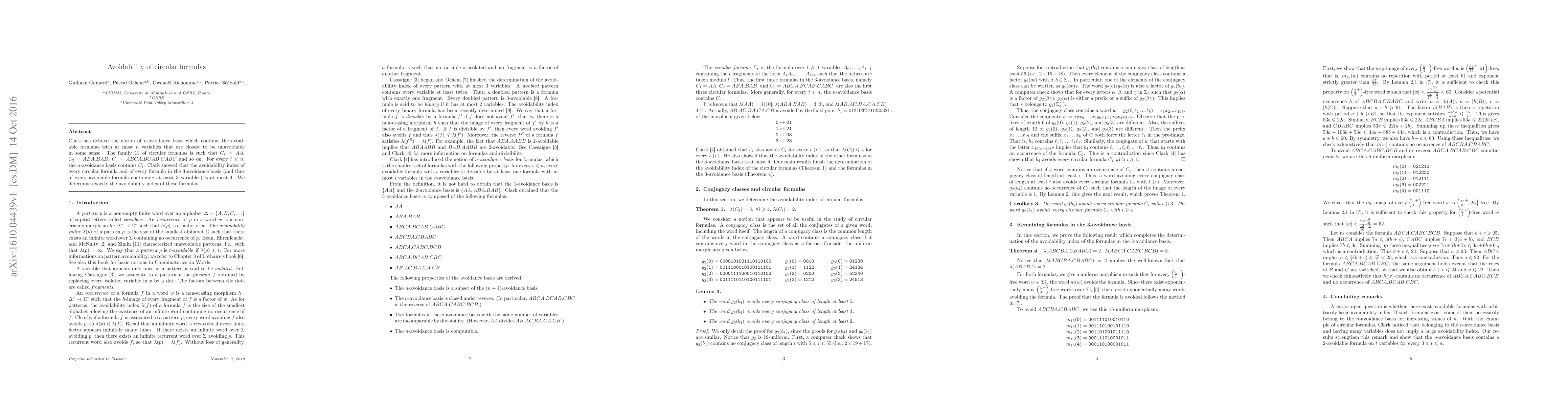 The paper determines the exact avoidability index of circular formulas and formulas in the 3-avoidance basis, using concepts like conjugacy classes, uniform morphisms, and avoidability index.