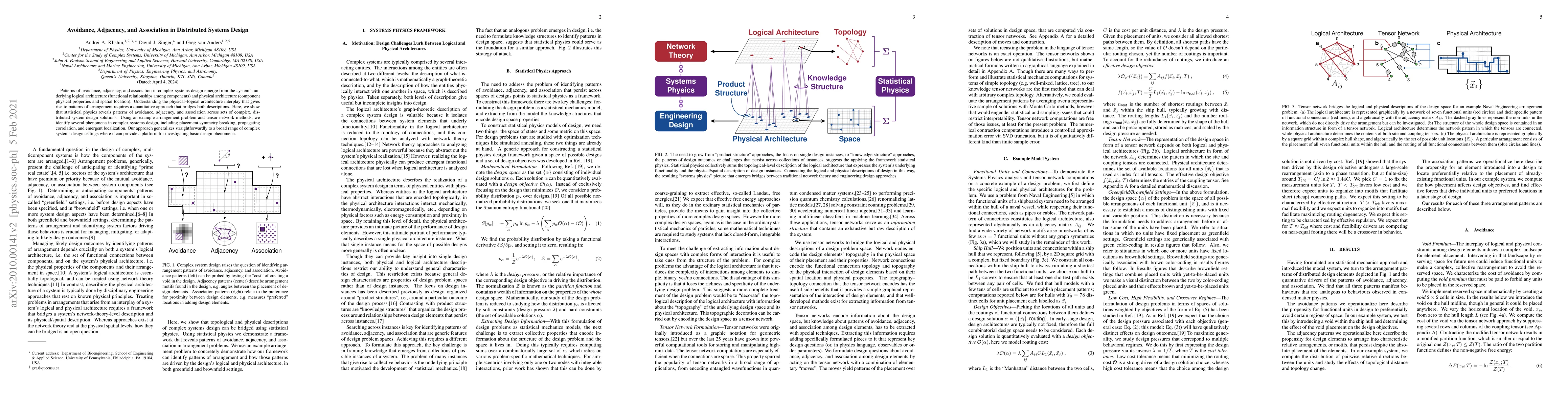 Patterns of avoidance, adjacency, and association in complex systems design emerge from the system's underlying logical architecture (functional relationships among components) and physical architecture (component physical properties and spatial location). Understanding the physical--logical architecture interplay that gives rise to patterns of arrangement requires a quantitative approach that bridges both descriptions. Here, we show that statistical physics reveals patterns of avoidance, adjacency, and association across sets of complex, distributed system design solutions. Using an example arrangement problem and tensor network methods, we identify several phenomena in complex systems design, including placement symmetry breaking, propagating correlation, and emergent localization. Our approach generalizes straightforwardly to a broad range of complex systems design settings where it can provide a platform for investigating basic design phenomena.