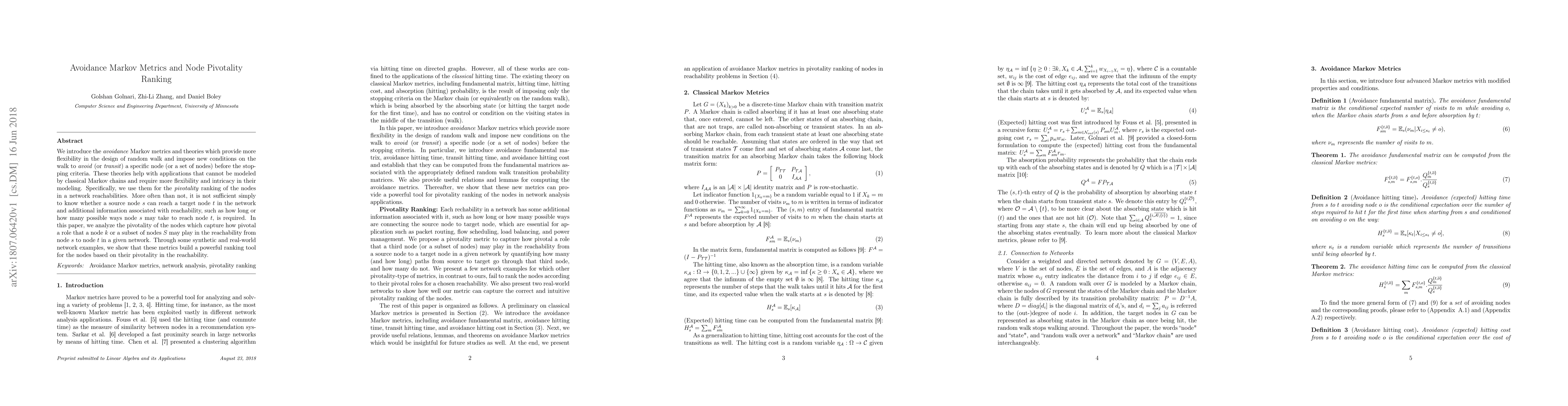 We introduce the avoidance Markov metrics and theories which provide more flexibility in the design of random walk and impose new conditions on the walk to avoid (or transit) a specific node (or a set of nodes) before the stopping criteria. These theories help with applications that cannot be modeled by classical Markov chains and require more flexibility and intricacy in their modeling. Specifically, we use them for the pivotality ranking of the nodes in a network reachabilities. More often than not, it is not sufficient simply to know whether a source node $s$ can reach a target node $t$ in the network and additional information associated with reachability, such as how long or how many possible ways node $s$ may take to reach node $t$, is required. In this paper, we analyze the pivotality of the nodes which capture how pivotal a role that a node $k$ or a subset of nodes $S$ may play in the reachability from node $s$ to node $t$ in a given network. Through some synthetic and real-world network examples, we show that these metrics build a powerful ranking tool for the nodes based on their pivotality in the reachability.