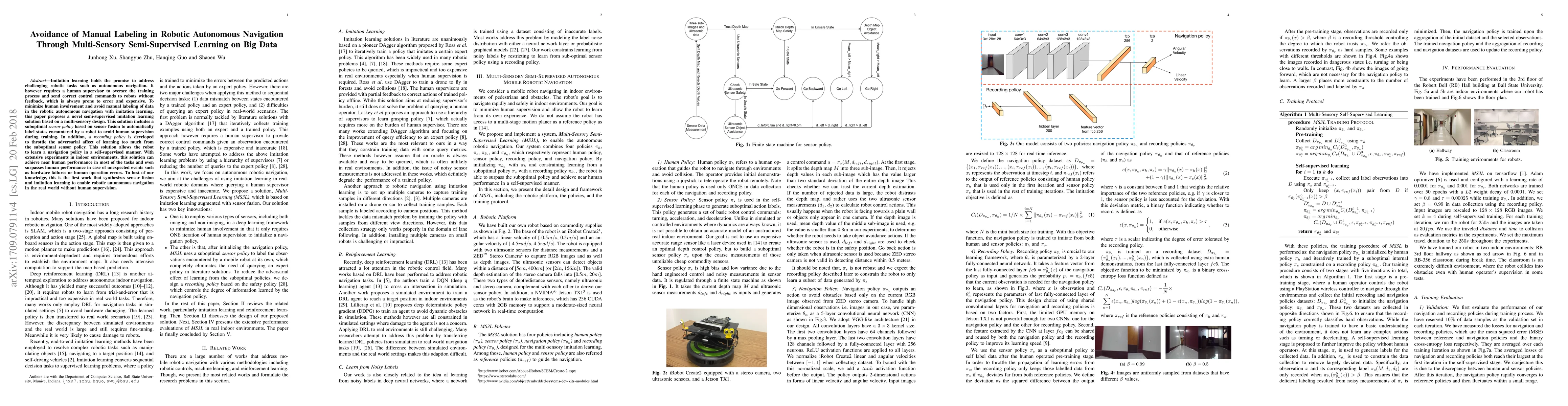 This paper proposes a semi-supervised imitation learning approach for robotic autonomous navigation that minimizes human involvement by using multi-sensory sensor fusion to automatically label states, thus avoiding manual data labeling. The method also includes a recording policy to mitigate the adverse effects of relying on suboptimal sensor policies, enabling the robot to achieve near-human performance in navigation tasks.