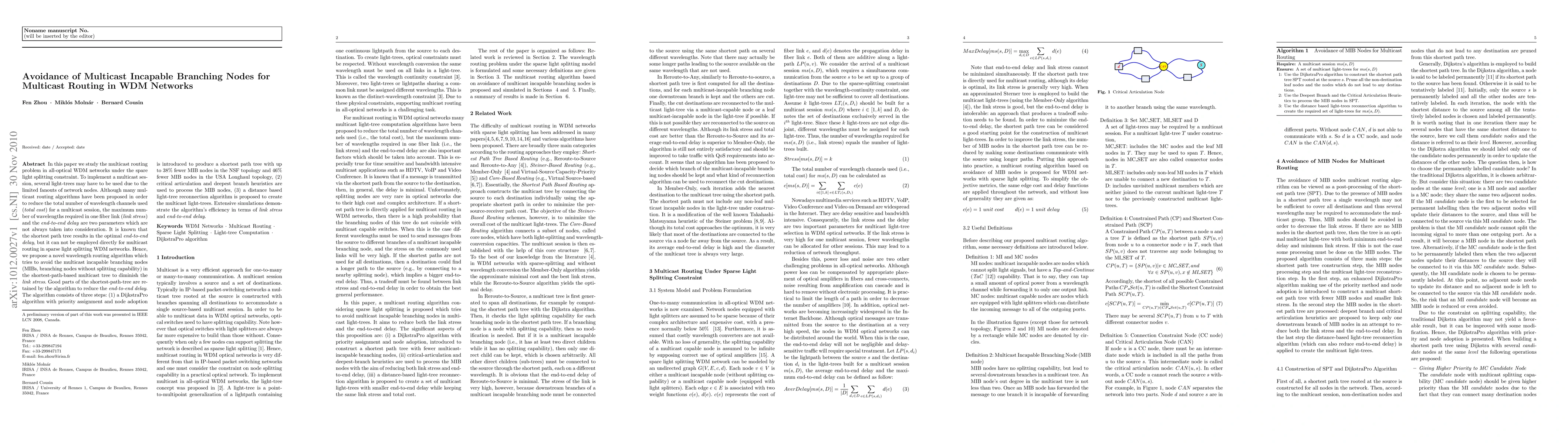 In this articlewestudy themulticast routing problem in all-opticalWDMnetworks under the spare light splitting constraint. To implement a multicast session, several light-trees may have to be used due to the limited fanouts of network nodes. Although many multicast routing algorithms have been proposed in order to reduce the total number of wavelength channels used (total cost) for a multicast session, the maximum number of wavelengths required in one fiber link (link stress) and the end-to-end delay are two parameters which are not always taken into consideration. It is known that the shortest path tree (SPT) results in the optimal end-to-end delay, but it can not be employed directly for multicast routing in sparse light splitting WDM networks. Hence, we propose a novel wavelength routing algorithm which tries to avoid the multicast incapable branching nodes (MIBs, branching nodes without splitting capability) in the shortest-path-based multicast tree to diminish the link stress. Good parts of the shortest-path-tree are retained by the algorithm to reduce the end-to-end delay. The algorithm consists of tree steps: (1) aDijkstraPro algorithmwith priority assignment and node adoption is introduced to produce a SPT with up to 38% fewer MIB nodes in the NSF topology and 46% fewerMIB nodes in the USA Longhaul topology, (2) critical articulation and deepest branch heuristics are used to process the MIB nodes, (3) a distance-based light-tree reconnection algorithm is proposed to create the multicast light-trees. Extensive simulations demonstrate the algorithm's efficiency in terms of link stress and end-to-end delay.