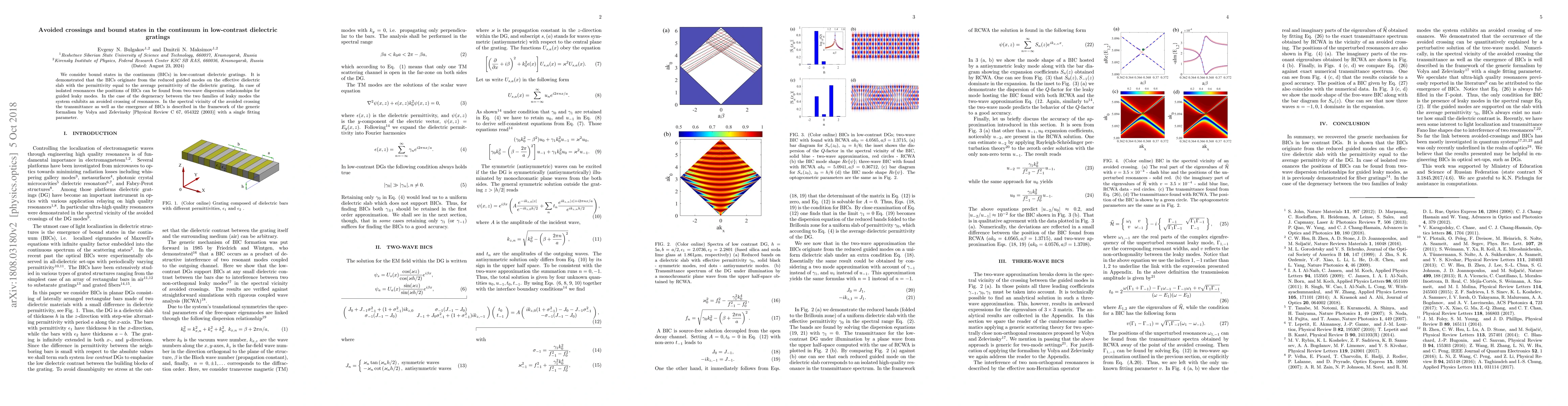 This research investigates bound states in the continuum (BICs) in low-contrast dielectric gratings, revealing that BICs arise from reduced guided modes. The study demonstrates avoided crossings in degenerate leaky modes and models the transmittance and BIC emergence near these crossings using a generic formalism with one fitting parameter.