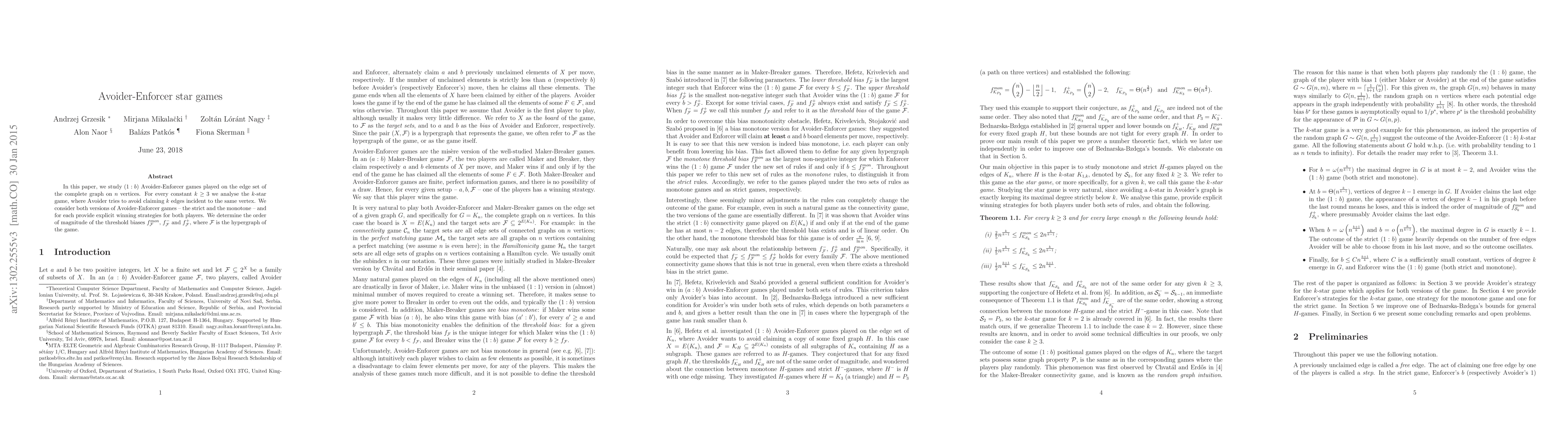 In this paper, we study $(1 : b)$ Avoider-Enforcer games played on the edge set of the complete graph on $n$ vertices. For every constant $k\geq 3$ we analyse the $k$-star game, where Avoider tries to avoid claiming $k$ edges incident to the same vertex. We analyse both versions of Avoider-Enforcer games -- the strict and the monotone -- and for each provide explicit winning strategies for both players. We determine the order of magnitude of the threshold biases $f^{mon}_\mathcal{F}$, $f^-_\mathcal{F}$ and $f^+_\mathcal{F}$, where $\mathcal{F}$ is the hypergraph of the game.