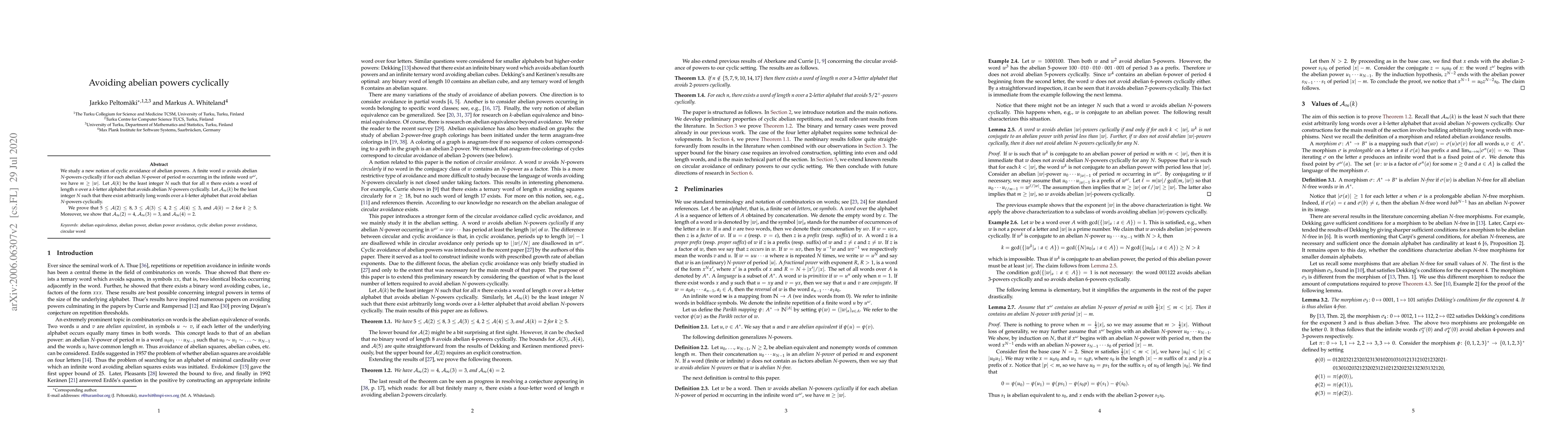 This paper investigates cyclic avoidance of abelian powers in finite words, determining the least integer $N$ such that words of any length over a $k$-letter alphabet avoid abelian $N$-powers cyclically. Results show that $\mathcal{A}(k) = 2$ for $k \geq 5$ and $\mathcal{A}_\infty(k) = 2$ for $k \geq 3$.
