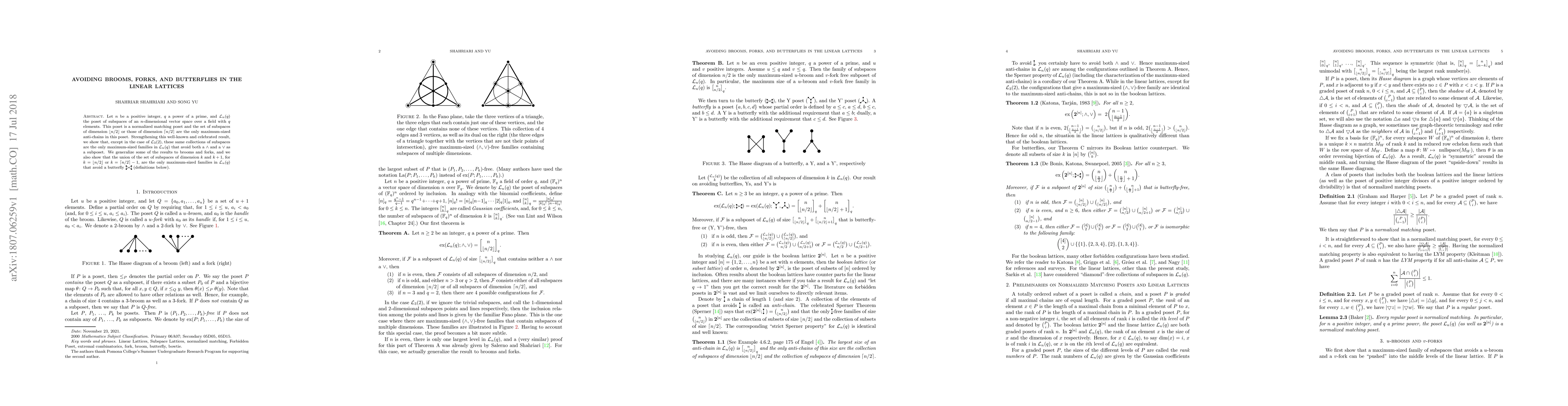 Let $n$ be a positive integer, $q$ a power of a prime, and $\mathcal{L}_n(q)$ the poset of subspaces of an $n$-dimensional vector space over a field with $q$ elements. This poset is a normalized matching poset and the set of subspaces of dimension $\left\lfloor n/2 \right\rfloor$ or those of dimension $\left\lceil n/2 \right\rceil$ are the only maximum-sized anti-chains in this poset. Strengthening this well-known and celebrated result, we show that, except in the case of $\mathcal{L}_3(2)$, these same collections of subspaces are the only maximum-sized families in $\mathcal{L}_n(q)$ that avoid both a $\wedge$ and a $\vee$ as a subposet. We generalize some of the results to brooms and forks, and we also show that the union of the set of subspaces of dimension $k$ and $k+1$, for $k = \left\lfloor n/2 \right\rfloor$ or $k = \left\lceil n/2 \right\rceil-1$, are the only maximum-sized families in $\mathcal{L}_n(q)$ that avoid a butterfly (definitions below).