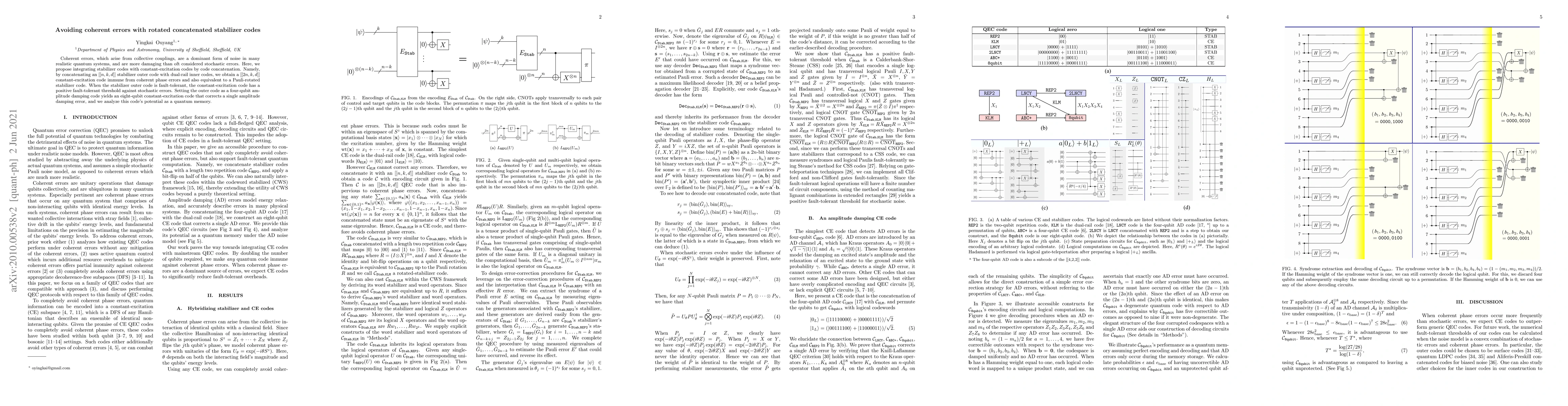 Coherent errors, which arise from collective couplings, are a dominant form of noise in many realistic quantum systems, and are more damaging than oft considered stochastic errors. Here, we propose integrating stabilizer codes with constant-excitation codes by code concatenation. Namely, by concatenating an $[[n,k,d]]$ stabilizer outer code with dual-rail inner codes, we obtain a $[[2n,k,d]]$ constant-excitation code immune from coherent phase errors and also equivalent to a Pauli-rotated stabilizer code. When the stabilizer outer code is fault-tolerant, the constant-excitation code has a positive fault-tolerant threshold against stochastic errors. Setting the outer code as a four-qubit amplitude damping code yields an eight-qubit constant-excitation code that corrects a single amplitude damping error, and we analyze this code's potential as a quantum memory.