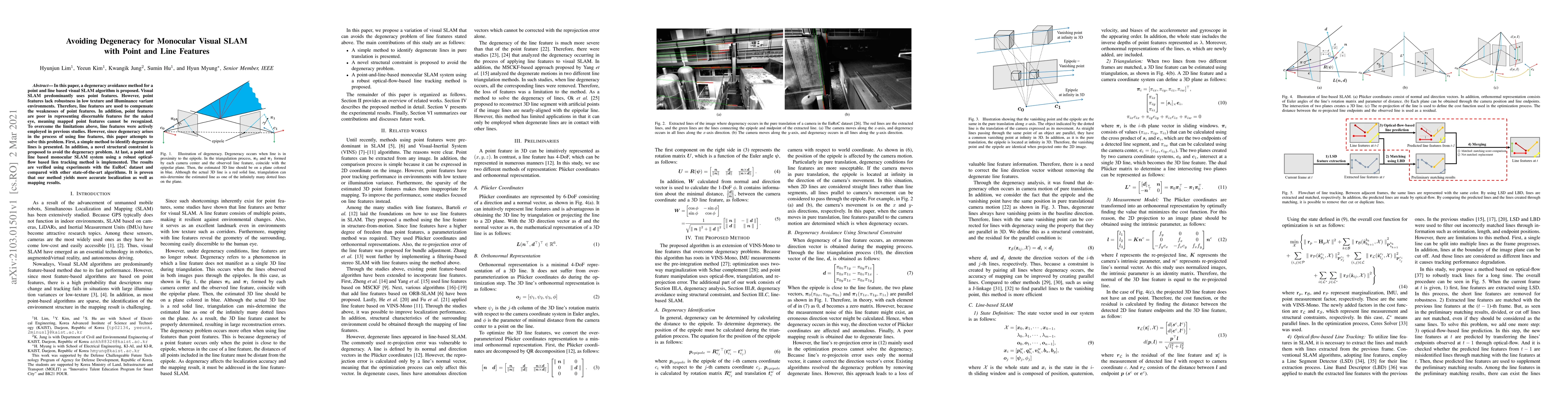 This paper proposes a method to avoid degeneracy in monocular visual SLAM using point and line features, addressing the limitations of point features in low texture environments. It introduces a structural constraint and a robust optical-flow based line tracking method, and demonstrates improved localization and mapping accuracy using the EuRoC dataset.