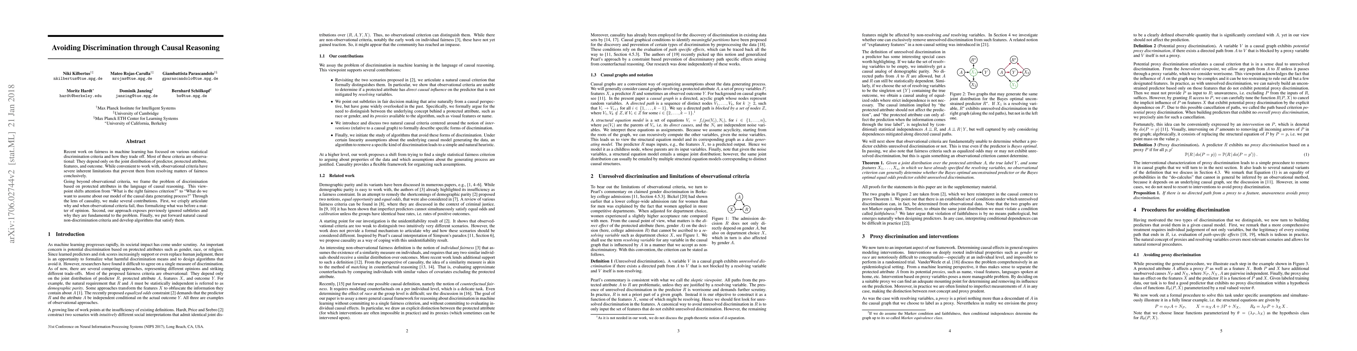 This paper shifts the focus from observational to causal reasoning in addressing discrimination in machine learning, articulating why observational criteria fail and proposing new causal non-discrimination criteria along with corresponding algorithms.