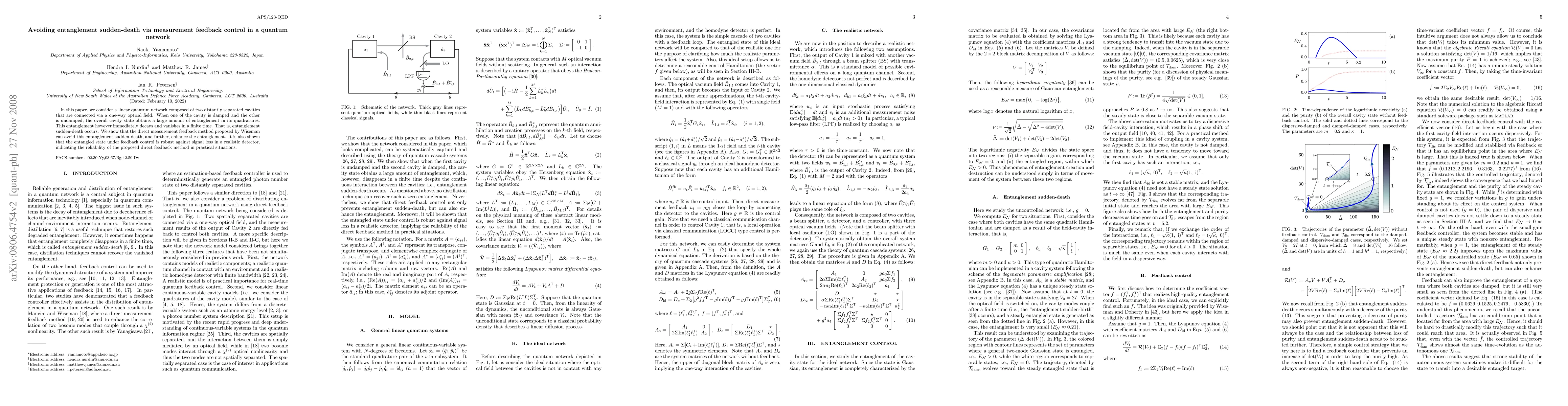 This paper explores a linear quantum network with two separated cavities connected by an optical field, where entanglement sudden-death occurs due to damping in one cavity. The authors propose a direct measurement feedback method to avoid this phenomenon and enhance the entanglement, demonstrating its robustness against signal loss in practical scenarios.