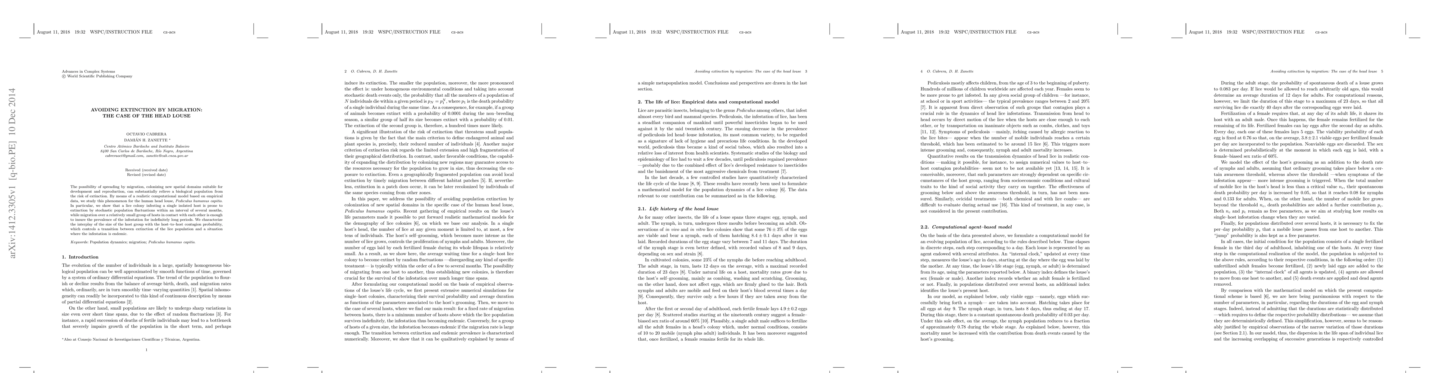 The possibility of spreading by migration, colonizing new spatial domains suitable for development and reproduction, can substantially relieve a biological population from the risk of extinction. By means of a realistic computational model based on empirical data, we study this phenomenon for the human head louse, Pediculus humanus capitis. In particular, we show that a lice colony infesting a single isolated host is prone to extinction by stochastic population fluctuations within an interval of several months, while migration over a relatively small group of hosts in contact with each other is enough to insure the prevalence of the infestation for indefinitely long periods. We characterize the interplay of the size of the host group with the host-to-host contagion probability, which controls a transition between extinction of the lice population and a situation where the infestation is endemic.
