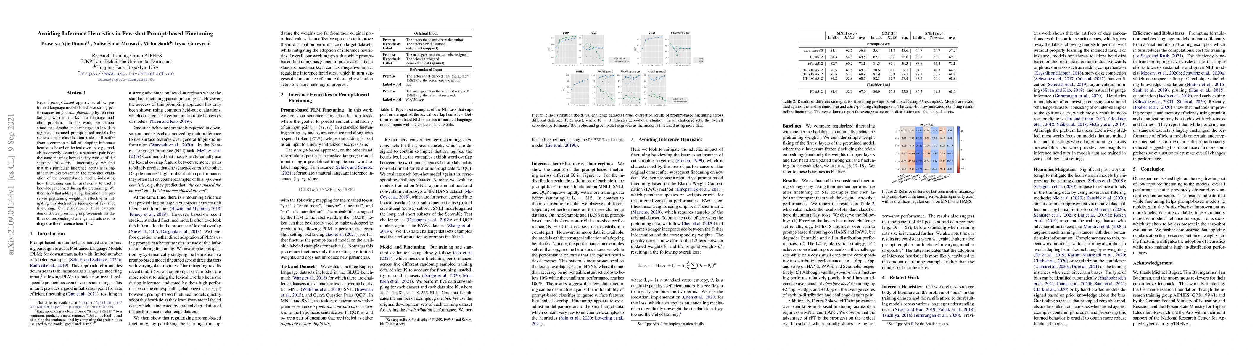 This paper investigates how few-shot finetuning of prompt-based language models can lead to the adoption of inference heuristics based on lexical overlap, despite their effectiveness in low data regimes. It proposes a regularization method to mitigate this issue, showing improved performance on three challenge datasets.