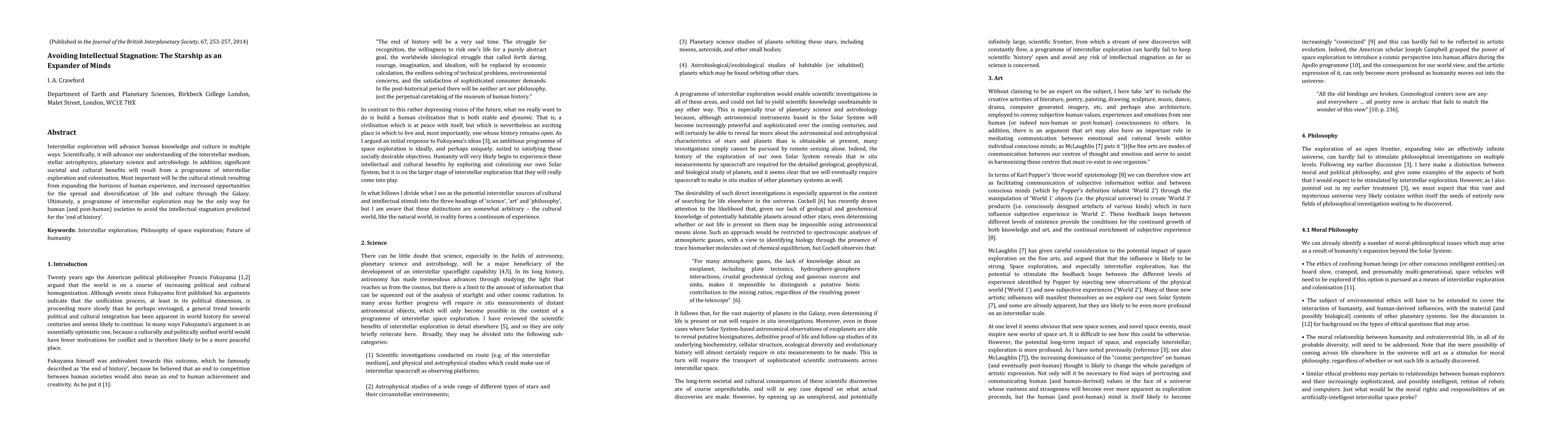 Interstellar exploration will advance human knowledge and culture in multiple ways. Scientifically, it will advance our understanding of the interstellar medium, stellar astrophysics, planetary science and astrobiology. In addition, significant societal and cultural benefits will result from a programme of interstellar exploration and colonisation. Most important will be the cultural stimuli resulting from expanding the horizons of human experience, and increased opportunities for the spread and diversification of life and culture through the Galaxy. Ultimately, a programme of interstellar exploration may be the only way for human (and post-human) societies to avoid the intellectual stagnation predicted for the "end of history".