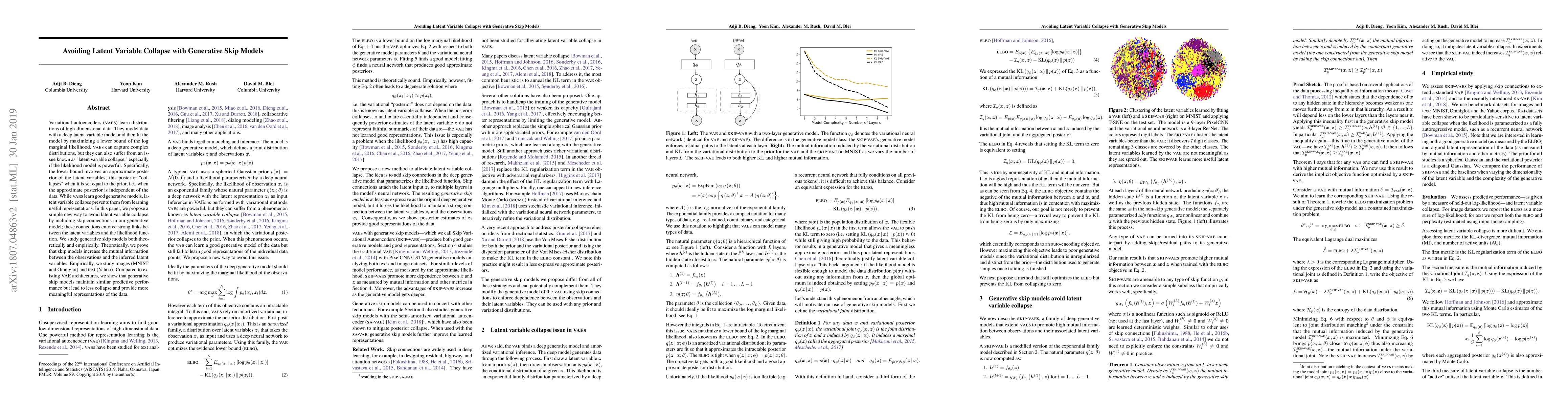 Variational autoencoders learn distributions of high-dimensional data. They model data with a deep latent-variable model and then fit the model by maximizing a lower bound of the log marginal likelihood. VAEs can capture complex distributions, but they can also suffer from an issue known as "latent variable collapse," especially if the likelihood model is powerful. Specifically, the lower bound involves an approximate posterior of the latent variables; this posterior "collapses" when it is set equal to the prior, i.e., when the approximate posterior is independent of the data. While VAEs learn good generative models, latent variable collapse prevents them from learning useful representations. In this paper, we propose a simple new way to avoid latent variable collapse by including skip connections in our generative model; these connections enforce strong links between the latent variables and the likelihood function. We study generative skip models both theoretically and empirically. Theoretically, we prove that skip models increase the mutual information between the observations and the inferred latent variables. Empirically, we study images (MNIST and Omniglot) and text (Yahoo). Compared to existing VAE architectures, we show that generative skip models maintain similar predictive performance but lead to less collapse and provide more meaningful representations of the data.