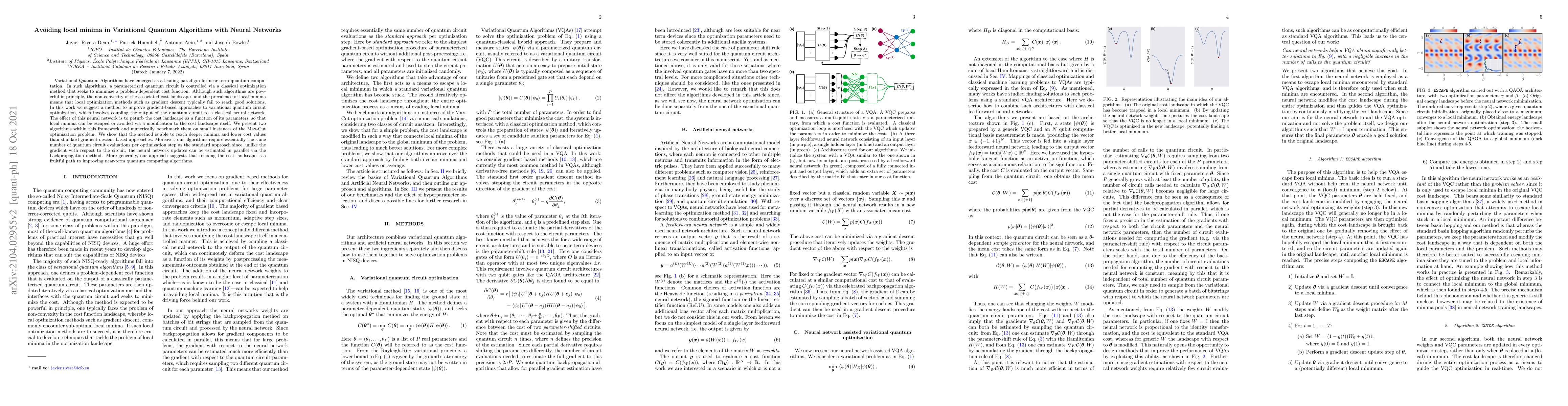 This paper proposes a method to enhance variational quantum algorithms by coupling quantum circuit outputs to a classical neural network, which perturbs the cost landscape to avoid local minima. The approach is shown to outperform standard gradient descent in finding deeper minima, demonstrated through benchmarking on the Max-Cut problem.
