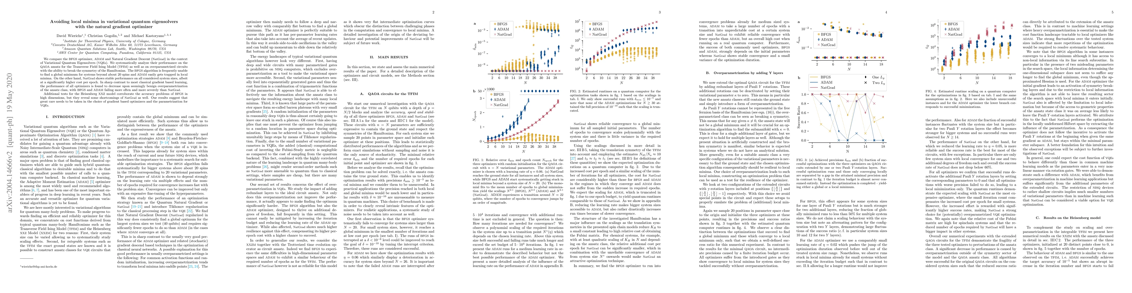 This paper compares the performance of BFGS, ADAM, and Natural Gradient Descent (NatGrad) optimizers in Variational Quantum Eigensolvers (VQEs), finding that NatGrad avoids local minima effectively across different system sizes, though it is more computationally expensive. The study highlights the challenges of overparametrization and the limitations of classical optimizers in high-dimensional quantum systems.