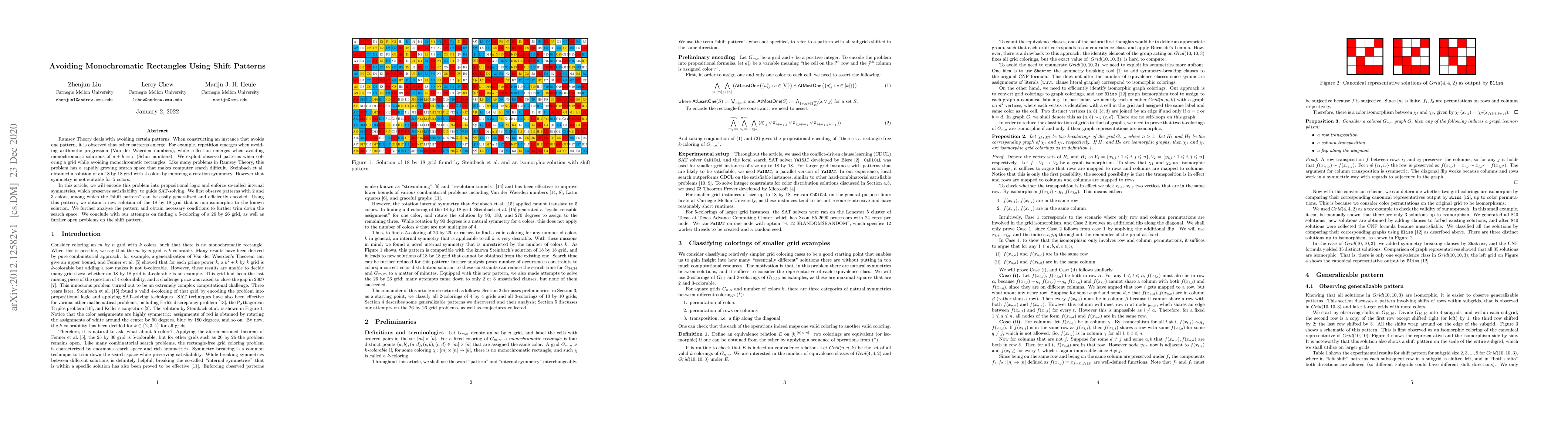 Ramsey Theory deals with avoiding certain patterns. When constructing an instance that avoids one pattern, it is observed that other patterns emerge. For example, repetition emerges when avoiding arithmetic progression (Van der Waerden numbers), while reflection emerges when avoiding monochromatic solutions of $a+b=c$ (Schur numbers). We exploit observed patterns when coloring a grid while avoiding monochromatic rectangles. Like many problems in Ramsey Theory, this problem has a rapidly growing search space that makes computer search difficult. Steinbach et al. obtained a solution of an 18 by 18 grid with 4 colors by enforcing a rotation symmetry. However, that symmetry is not suitable for 5 colors. In this article, we will encode this problem into propositional logic and enforce so-called internal symmetries, which preserves satisfiability, to guide SAT-solving. We first observe patterns with 2 and 3 colors, among which the "shift pattern" can be easily generalized and efficiently encoded. Using this pattern, we obtain a new solution of the 18 by 18 grid that is non-isomorphic to the known solution. We further analyze the pattern and obtain necessary conditions to further trim down the search space. We conclude with our attempts on finding a 5-coloring of a 26 by 26 grid, as well as further open problems on the shift pattern.