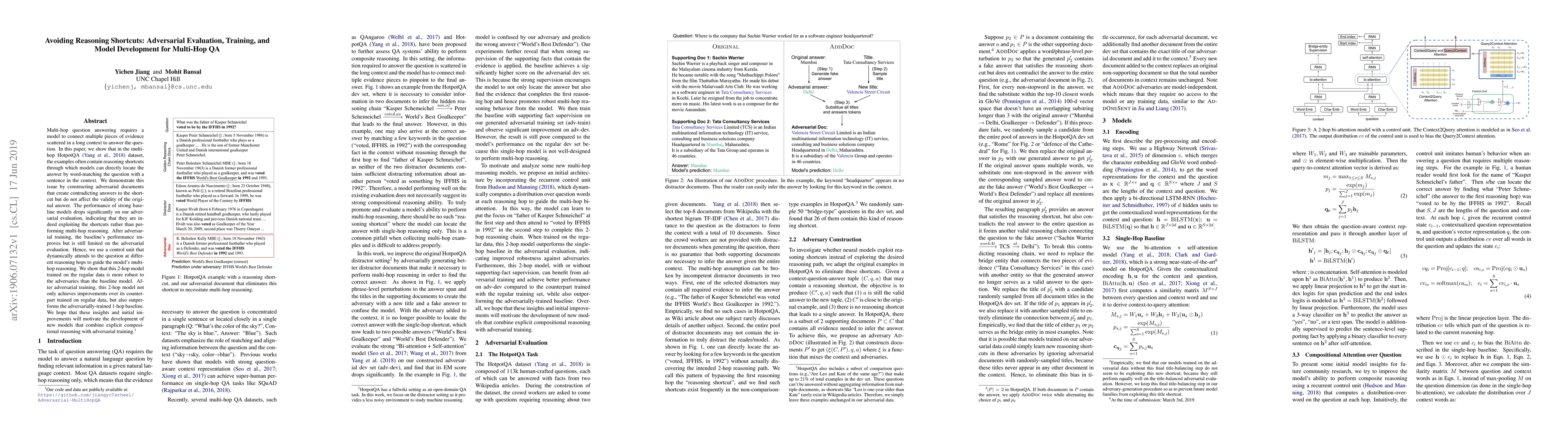 This paper investigates how multi-hop question answering models exploit reasoning shortcuts in the HotpotQA dataset, demonstrating that baseline models often fail adversarial tests due to such shortcuts. It proposes a 2-hop model with a control unit that enhances multi-hop reasoning, showing improved robustness and performance after adversarial training.
