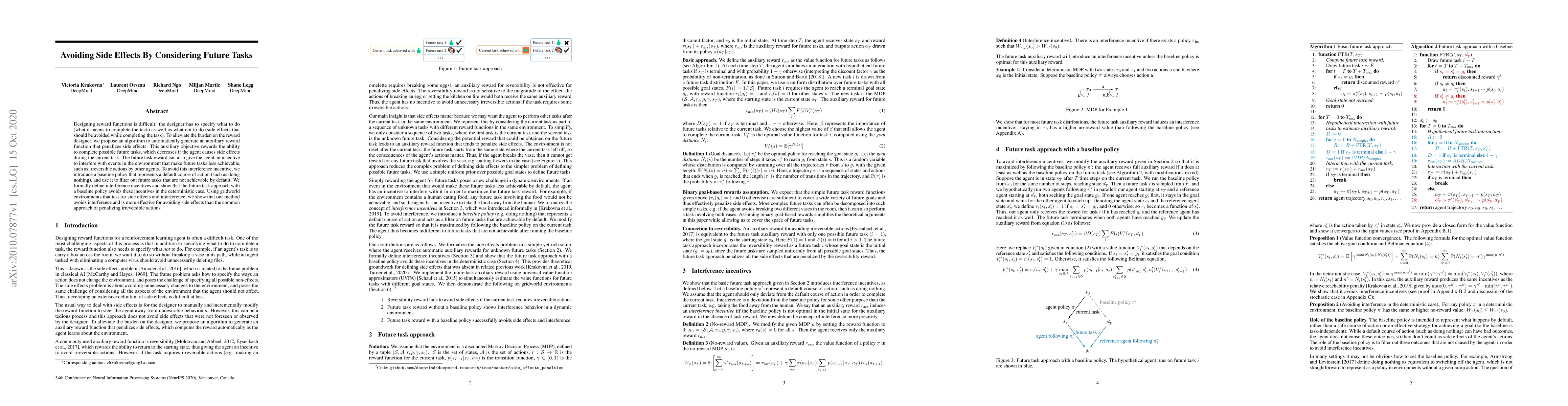 Designing reward functions is difficult: the designer has to specify what to do (what it means to complete the task) as well as what not to do (side effects that should be avoided while completing the task). To alleviate the burden on the reward designer, we propose an algorithm to automatically generate an auxiliary reward function that penalizes side effects. This auxiliary objective rewards the ability to complete possible future tasks, which decreases if the agent causes side effects during the current task. The future task reward can also give the agent an incentive to interfere with events in the environment that make future tasks less achievable, such as irreversible actions by other agents. To avoid this interference incentive, we introduce a baseline policy that represents a default course of action (such as doing nothing), and use it to filter out future tasks that are not achievable by default. We formally define interference incentives and show that the future task approach with a baseline policy avoids these incentives in the deterministic case. Using gridworld environments that test for side effects and interference, we show that our method avoids interference and is more effective for avoiding side effects than the common approach of penalizing irreversible actions.