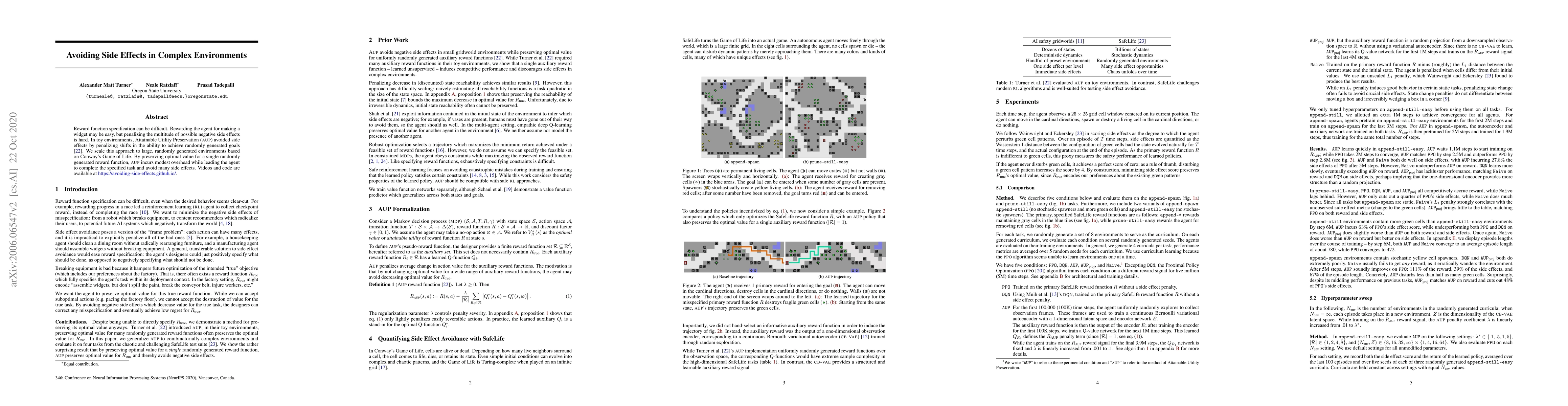 Reward function specification can be difficult. Rewarding the agent for making a widget may be easy, but penalizing the multitude of possible negative side effects is hard. In toy environments, Attainable Utility Preservation (AUP) avoided side effects by penalizing shifts in the ability to achieve randomly generated goals. We scale this approach to large, randomly generated environments based on Conway's Game of Life. By preserving optimal value for a single randomly generated reward function, AUP incurs modest overhead while leading the agent to complete the specified task and avoid many side effects. Videos and code are available at https://avoiding-side-effects.github.io/.