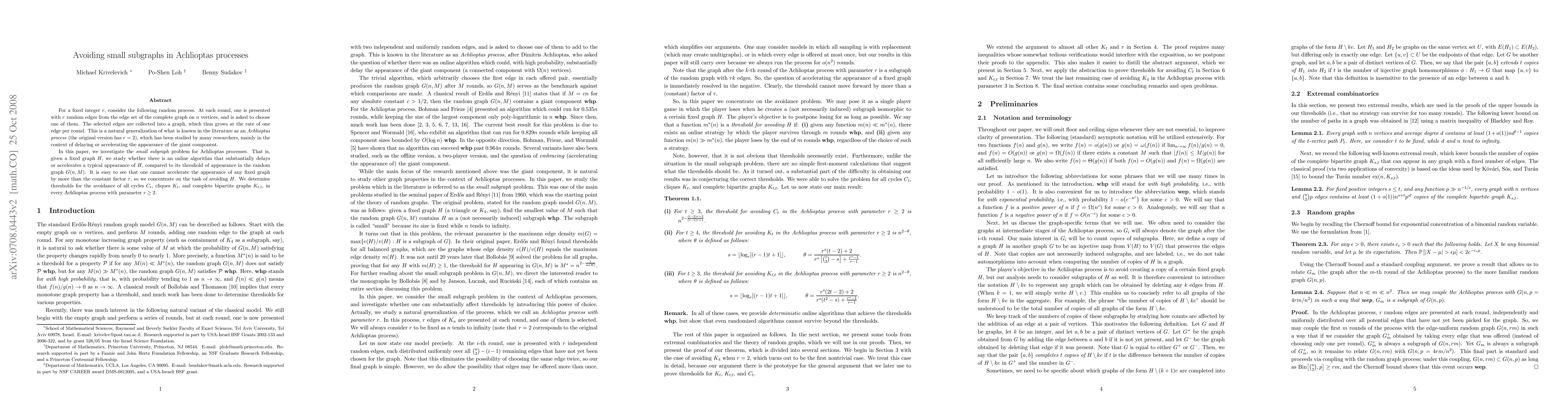 Researchers investigated a way to avoid certain small subgraphs in graphs generated by an Achlioptas process, which can delay or accelerate the appearance of giant components, and found thresholds for avoiding cycles, cliques, and bipartite graphs.