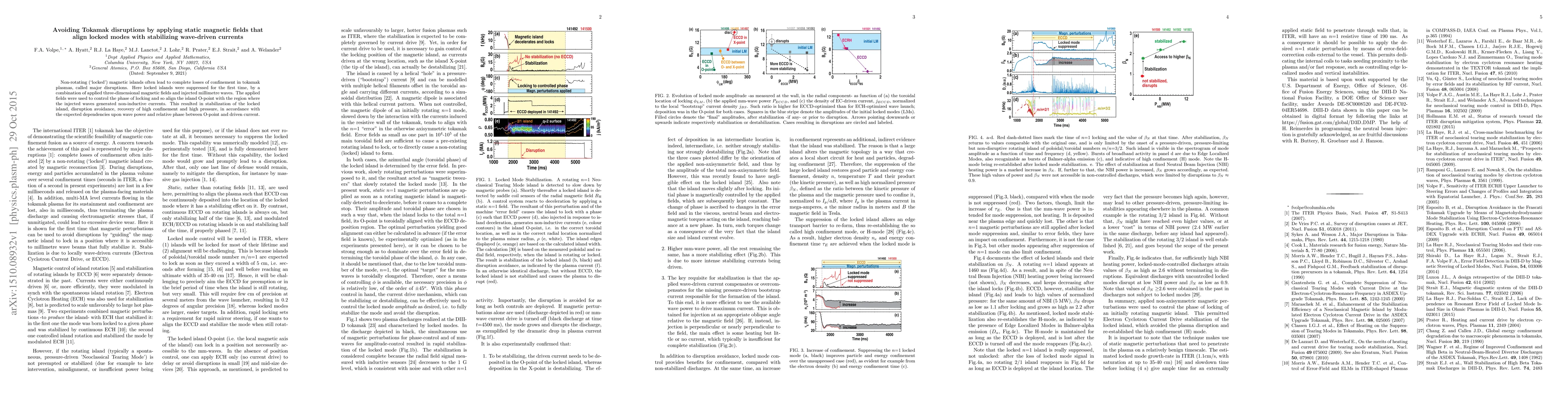This paper demonstrates the suppression of disruptive magnetic islands in tokamak plasmas by applying static magnetic fields to align locked modes with wave-driven stabilizing currents, thereby avoiding major disruptions and restoring high confinement and pressure. The method involves controlling the phase of locking through three-dimensional magnetic fields and millimeter wave injection.