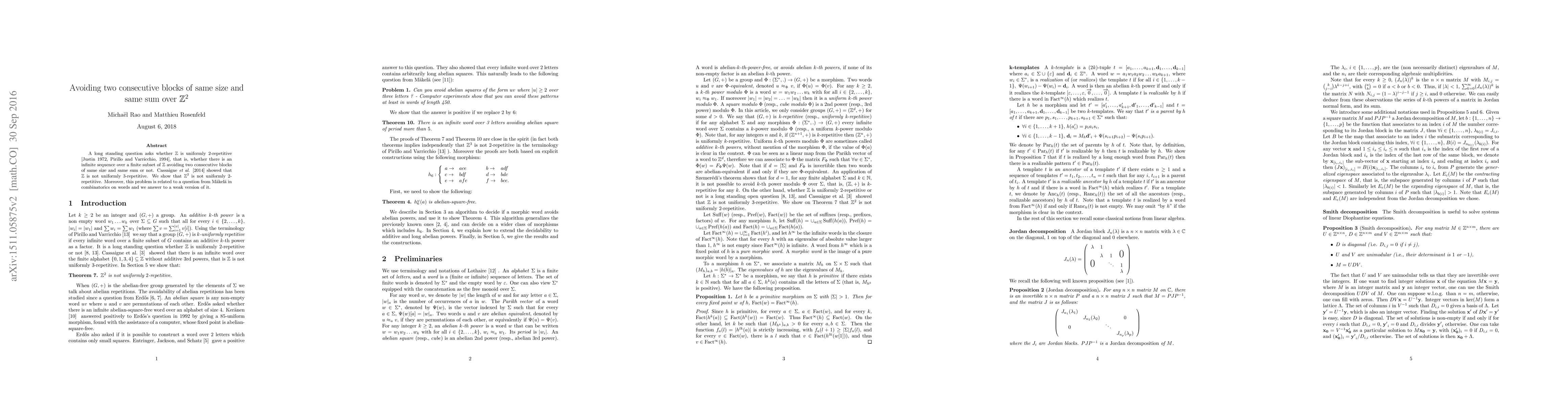 A long standing question asks whether $\mathbb{Z}$ is uniformly 2-repetitive [Justin 1972, Pirillo and Varricchio, 1994], that is, whether there is an infinite sequence over a finite subset of $\mathbb{Z}$ avoiding two consecutive blocks of same size and same sum or not. Cassaigne \emph{et al.} [2014] showed that $\mathbb{Z}$ is not uniformly 3-repetitive. We show that $\mathbb{Z}^2$ is not uniformly 2-repetitive. Moreover, this problem is related to a question from M\"akel\"a in combinatorics on words and we answer to a weak version of it.