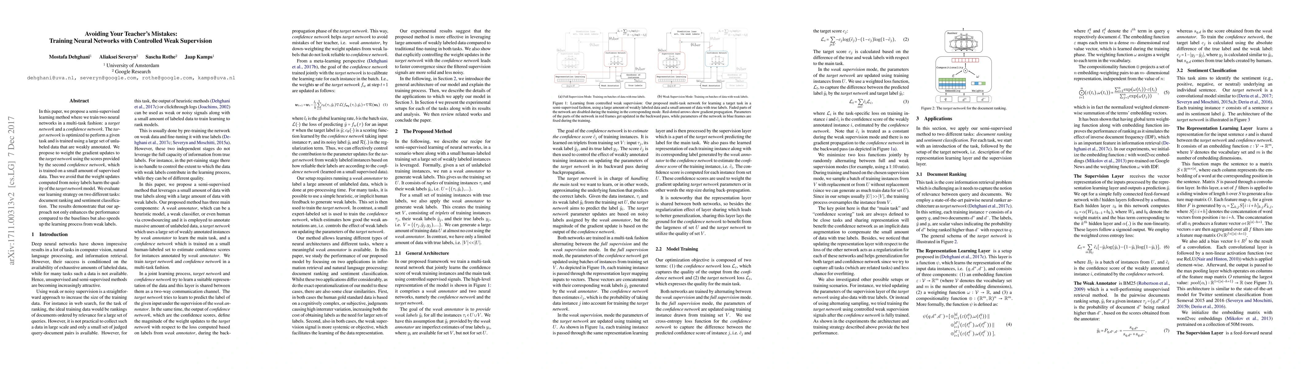 This paper proposes a semi-supervised learning method to train neural networks using weak supervision, by employing two networks: a target network for the main task and a confidence network for assessing label quality. The target network's updates are weighted by the confidence network, improving performance and learning speed over baselines in document ranking and sentiment classification tasks.
