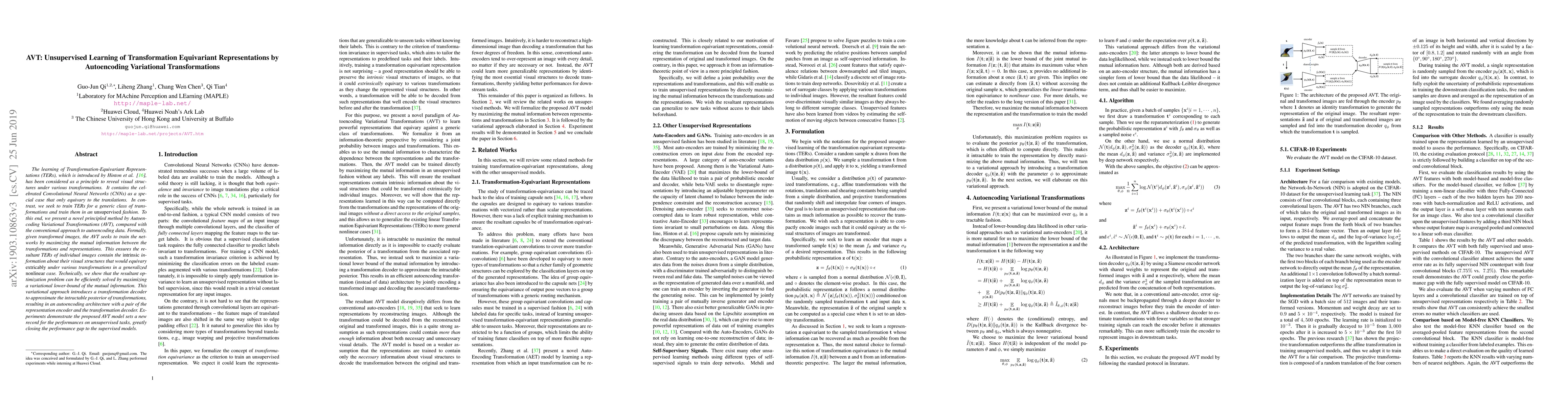 This paper introduces a novel unsupervised learning method called Autoencoding Variational Transformations (AVT) to train Transformation-Equivariant Representations (TERs) for a broad class of transformations. AVT maximizes mutual information between transformations and representations, achieving intrinsic visual structure equivary under various nonlinear transformations, and sets new records in unsupervised task performance.
