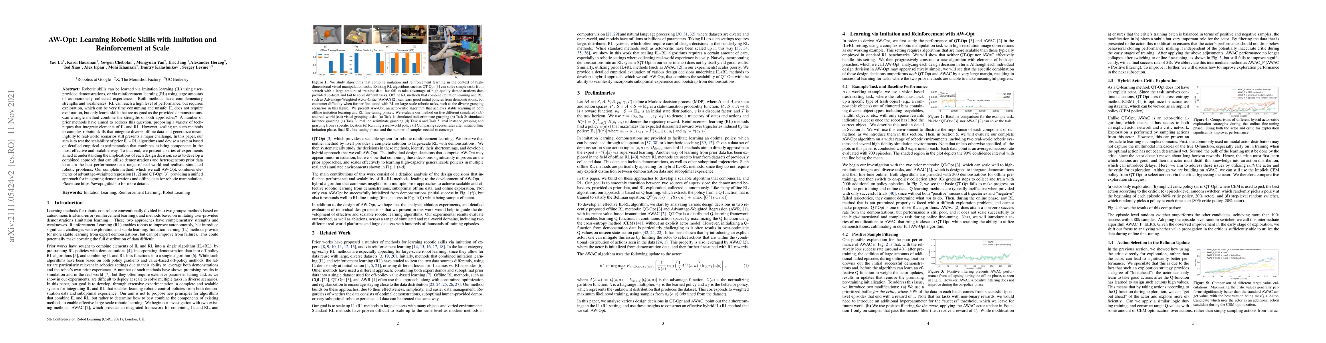 Robotic skills can be learned via imitation learning (IL) using user-provided demonstrations, or via reinforcement learning (RL) using large amountsof autonomously collected experience.Both methods have complementarystrengths and weaknesses: RL can reach a high level of performance, but requiresexploration, which can be very time consuming and unsafe; IL does not requireexploration, but only learns skills that are as good as the provided demonstrations.Can a single method combine the strengths of both approaches? A number ofprior methods have aimed to address this question, proposing a variety of tech-niques that integrate elements of IL and RL. However, scaling up such methodsto complex robotic skills that integrate diverse offline data and generalize mean-ingfully to real-world scenarios still presents a major challenge. In this paper, ouraim is to test the scalability of prior IL + RL algorithms and devise a system basedon detailed empirical experimentation that combines existing components in themost effective and scalable way. To that end, we present a series of experimentsaimed at understanding the implications of each design decision, so as to develop acombined approach that can utilize demonstrations and heterogeneous prior datato attain the best performance on a range of real-world and realistic simulatedrobotic problems. Our complete method, which we call AW-Opt, combines ele-ments of advantage-weighted regression [1, 2] and QT-Opt [3], providing a unifiedapproach for integrating demonstrations and offline data for robotic manipulation.Please see https://awopt.github.io for more details.
