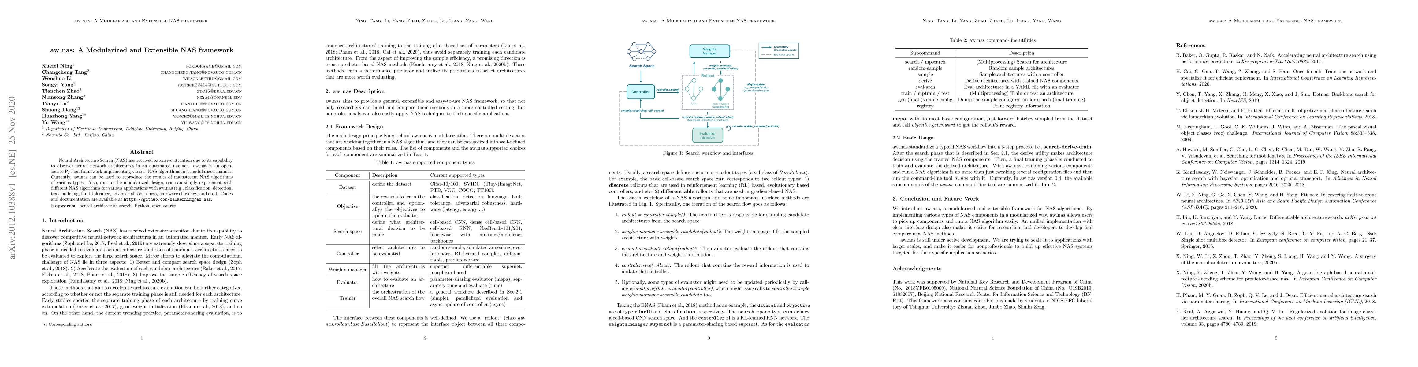Summary: aw_nas is an open-source Python framework for modularized Neural Architecture Search (NAS), enabling reproduction of mainstream NAS algorithms and experimentation with various applications. Its modular design facilitates easy integration of different NAS algorithms.
