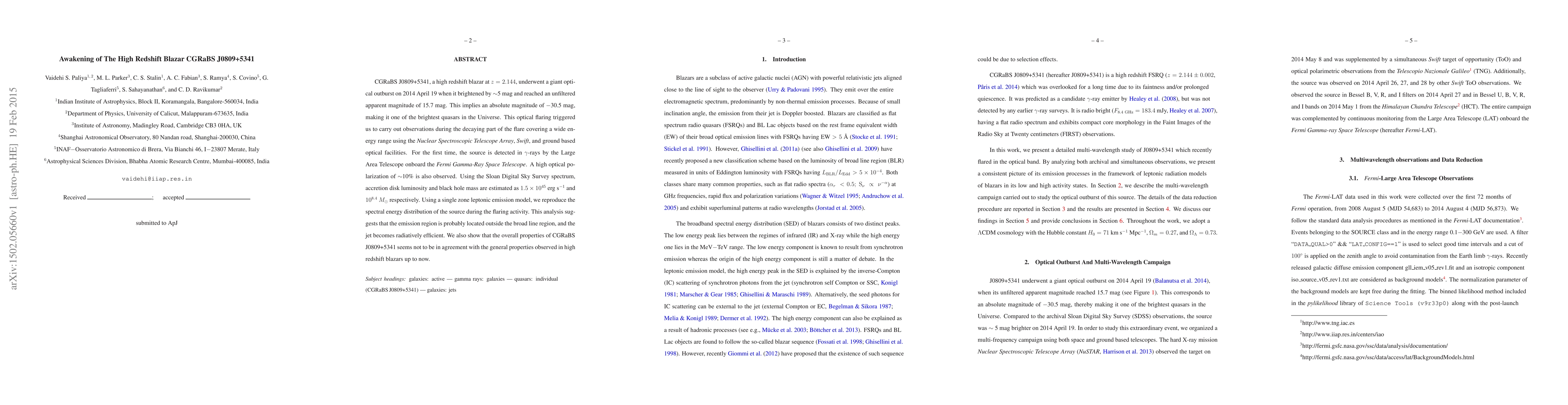 CGRaBS J0809+5341, a high redshift blazar at z = 2.144, underwent a giant optical outburst on 2014 April 19 when it brightened by $\sim$5 mag and reached an unfiltered apparent magnitude of 15.7 mag. This implies an absolute magnitude of -30.5 mag, making it one of the brightest quasars in the Universe. This optical flaring triggered us to carry out observations during the decaying part of the flare covering a wide energy range using the {\it Nuclear Spectroscopic Telescope Array}, {\it Swift}, and ground based optical facilities. For the first time, the source is detected in $\gamma$-rays by the Large Area Telescope onboard the {\it Fermi Gamma-Ray Space Telescope}. A high optical polarization of $\sim$10\% is also observed. Using the Sloan Digital Sky Survey spectrum, accretion disk luminosity and black hole mass are estimated as $1.5 \times 10^{45}$ erg s$^{-1}$ and $10^{8.4}~M_{\odot}$ respectively. Using a single zone leptonic emission model, we reproduce the spectral energy distribution of the source during the flaring activity. This analysis suggests that the emission region is probably located outside the broad line region, and the jet becomes radiatively efficient. We also show that the overall properties of CGRaBS J0809+5341 seems not to be in agreement with the general properties observed in high redshift blazars up to now.