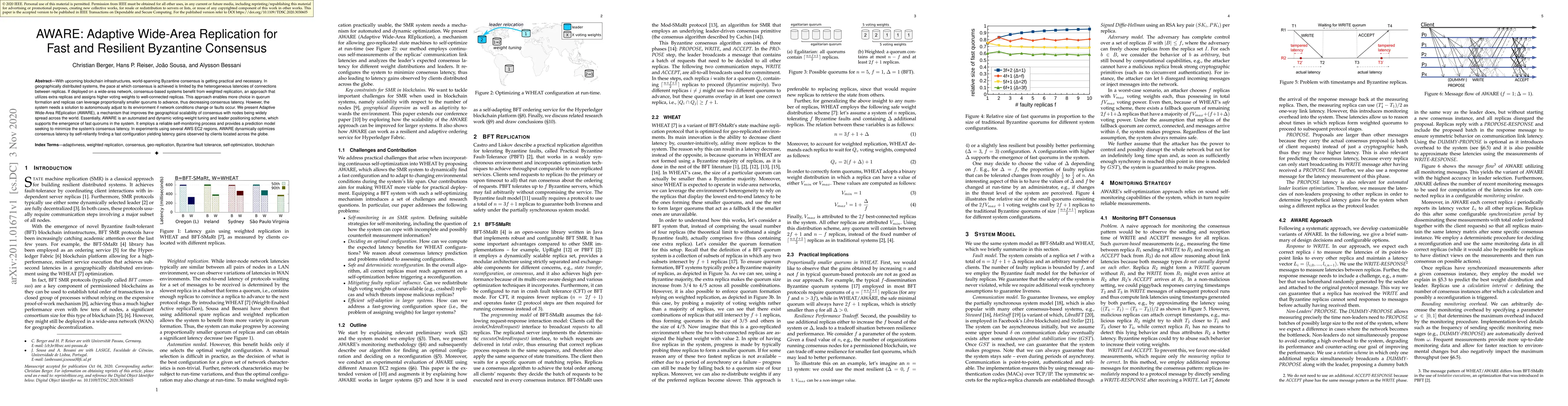 AWARE is a dynamic replication mechanism for achieving fast and resilient Byzantine consensus in geographically distributed systems. It autonomously adjusts voting weights and leader positions to optimize consensus latency, leveraging self-monitoring and predictive modeling to respond to network changes and faults.