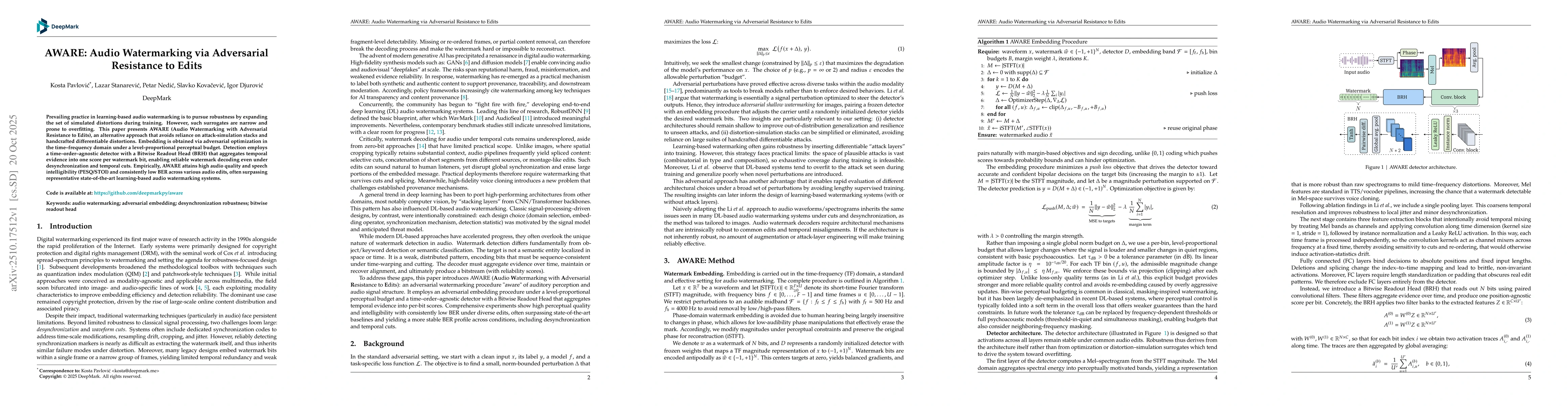 AWARE employs adversarial optimization in the time-frequency domain with a level-proportional perceptual budget. It uses a Bitwise Readout Head (BRH) detector that aggregates temporal evidence for watermark bits.