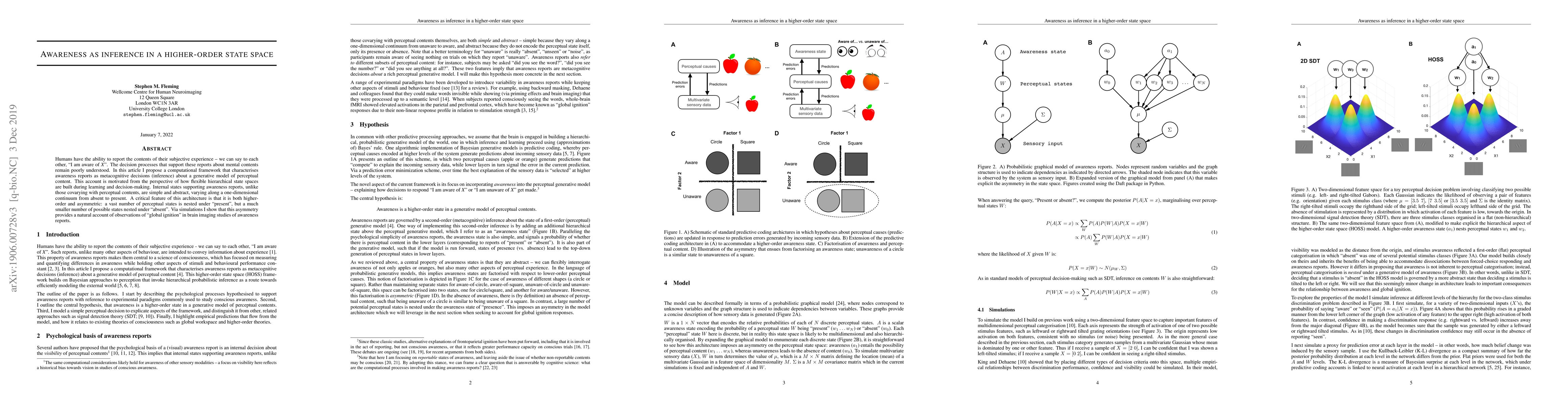 This paper proposes a computational framework for understanding awareness reports as metacognitive inferences about perceptual content, grounded in hierarchical state spaces. Simulations demonstrate that this higher-order, asymmetric model explains brain imaging observations of 'global ignition' in awareness reports.
