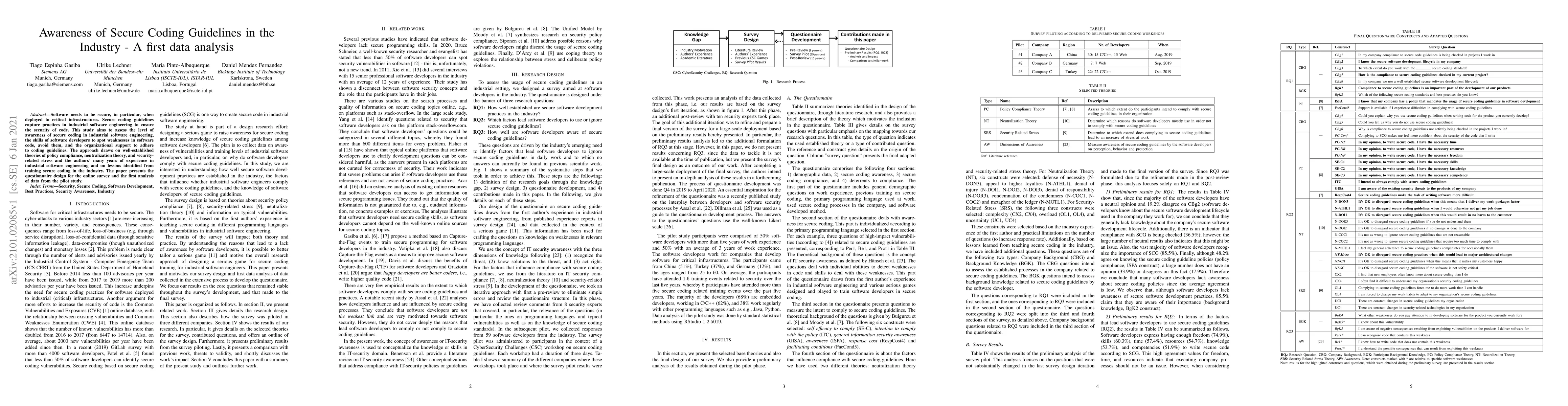 Software needs to be secure, in particular, when deployed to critical infrastructures. Secure coding guidelines capture practices in industrial software engineering to ensure the security of code. This study aims to assess the level of awareness of secure coding in industrial software engineering, the skills of software developers to spot weaknesses in software code, avoid them, and the organizational support to adhere to coding guidelines. The approach draws on well-established theories of policy compliance, neutralization theory, and security-related stress and the authors' many years of experience in industrial software engineering and on lessons identified from training secure coding in the industry. The paper presents the questionnaire design for the online survey and the first analysis of data from the pilot study.