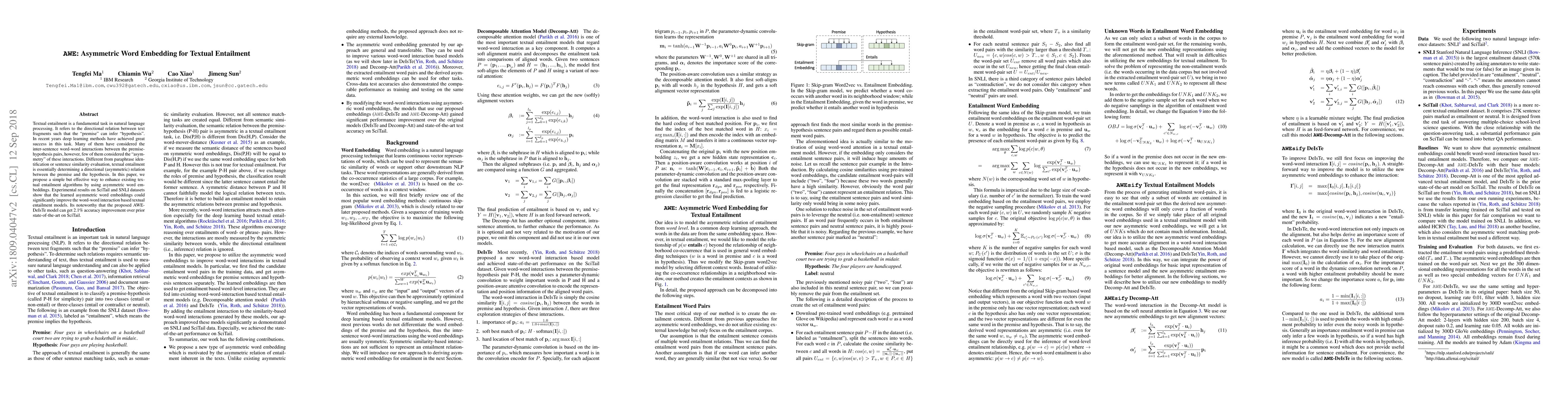 This paper proposes AWE, asymmetric word embeddings, to enhance textual entailment models by considering the directional nature of premise-hypothesis interactions. The AWE-DeIsTe model achieves a 2.1% accuracy improvement over the state-of-the-art on the SciTail dataset, demonstrating the effectiveness of incorporating asymmetry in word interactions.