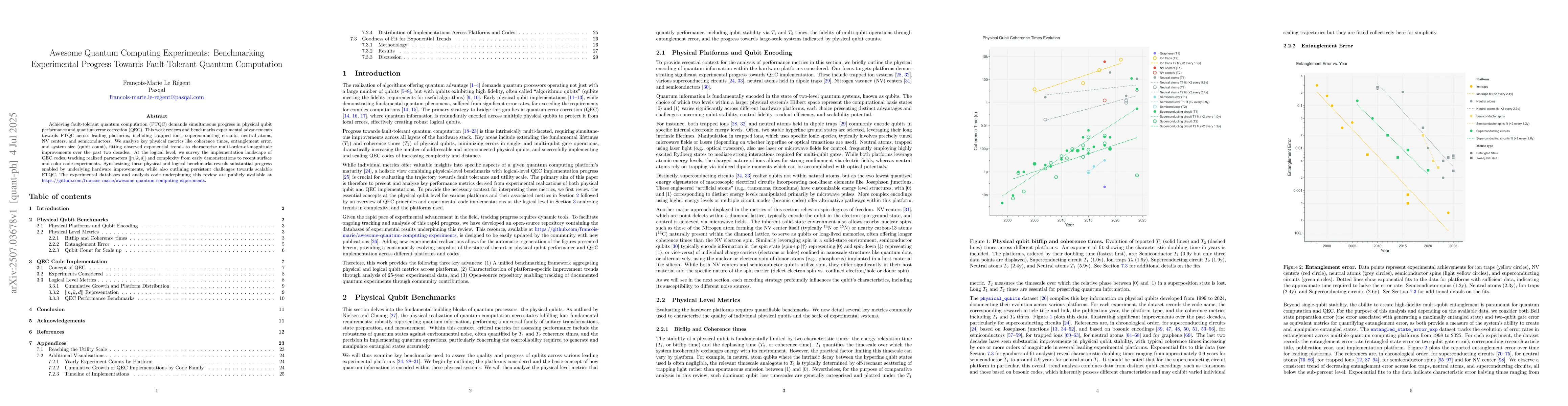 Achieving fault-tolerant quantum computation (FTQC) demands simultaneous progress in physical qubit performance and quantum error correction (QEC). This work reviews and benchmarks experimental advancements towards FTQC across leading platforms, including trapped ions, superconducting circuits, neutral atoms, NV centers, and semiconductors. We analyze key physical metrics like coherence times, entanglement error, and system size (qubit count), fitting observed exponential trends to characterize multi-order-of-magnitude improvements over the past two decades. At the logical level, we survey the implementation landscape of QEC codes, tracking realized parameters $[[n, k, d]]$ and complexity from early demonstrations to recent surface and color code experiments. Synthesizing these physical and logical benchmarks reveals substantial progress enabled by underlying hardware improvements, while also outlining persistent challenges towards scalable FTQC. The experimental databases and analysis code underpinning this review are publicly available at https://github.com/francois-marie/awesome-quantum-computing-experiments.