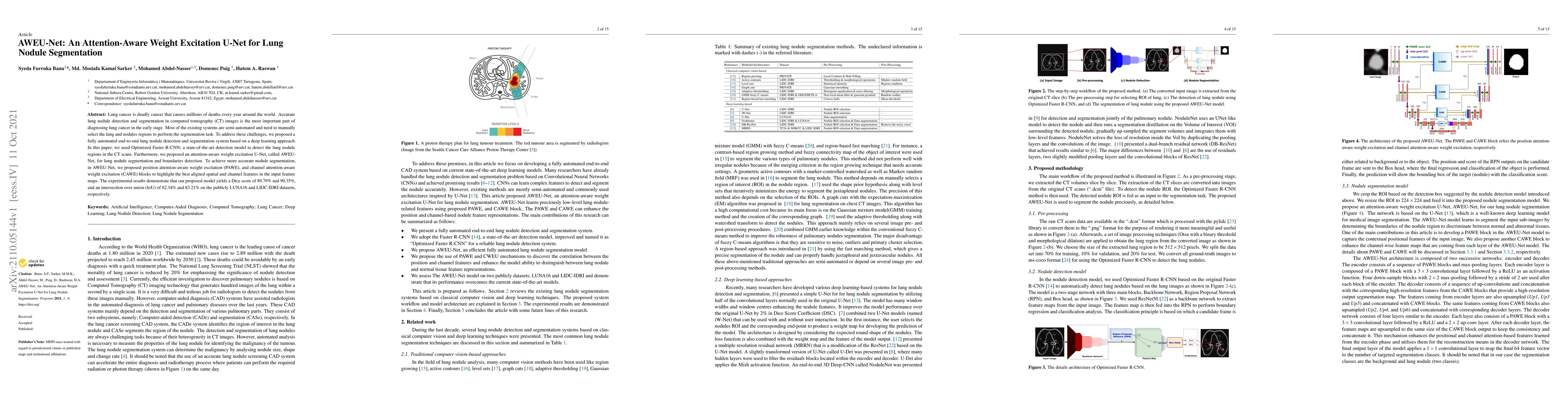 This paper proposes a fully automated deep learning system for lung nodule detection and segmentation using a combination of Optimized Faster R-CNN for detection and an attention-aware weight excitation U-Net (AWEU-Net) for segmentation. The AWEU-Net incorporates position and channel attention mechanisms to enhance feature extraction, achieving high Dice scores and IoU on LUNA16 and LIDC-IDRI datasets.