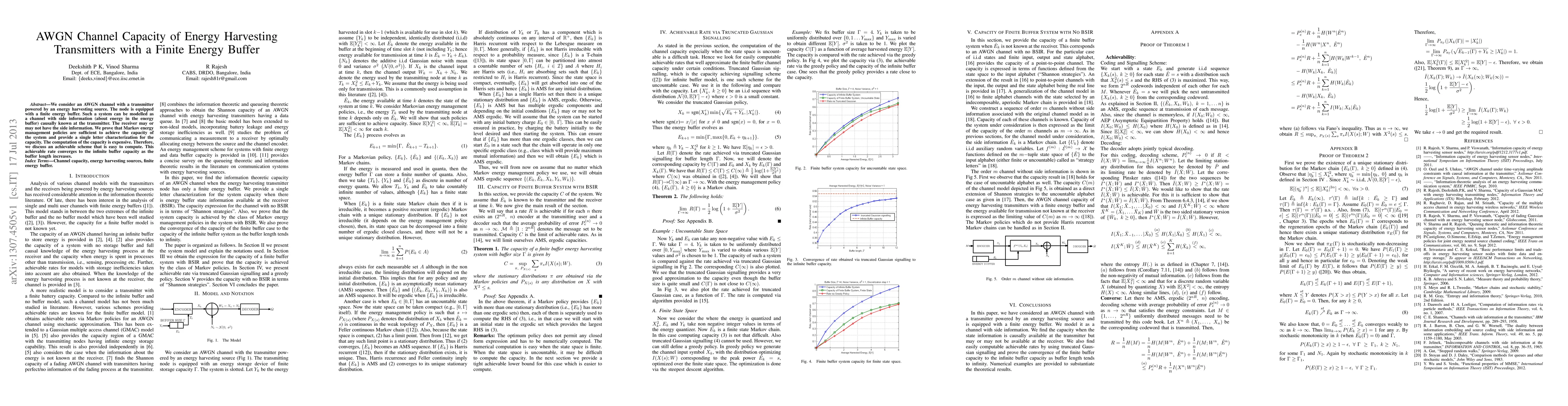 We consider an AWGN channel with a transmitter powered by an energy harvesting source. The node is equipped with a finite energy buffer. Such a system can be modelled as a channel with side information (about energy in the energy buffer) causally known at the transmitter. The receiver may or may not have the side information. We prove that Markov energy management policies are sufficient to achieve the capacity of the system and provide a single letter characterization for the capacity. The computation of the capacity is expensive. Therefore, we discuss an achievable scheme that is easy to compute. This achievable rate converges to the infinite buffer capacity as the buffer length increases.