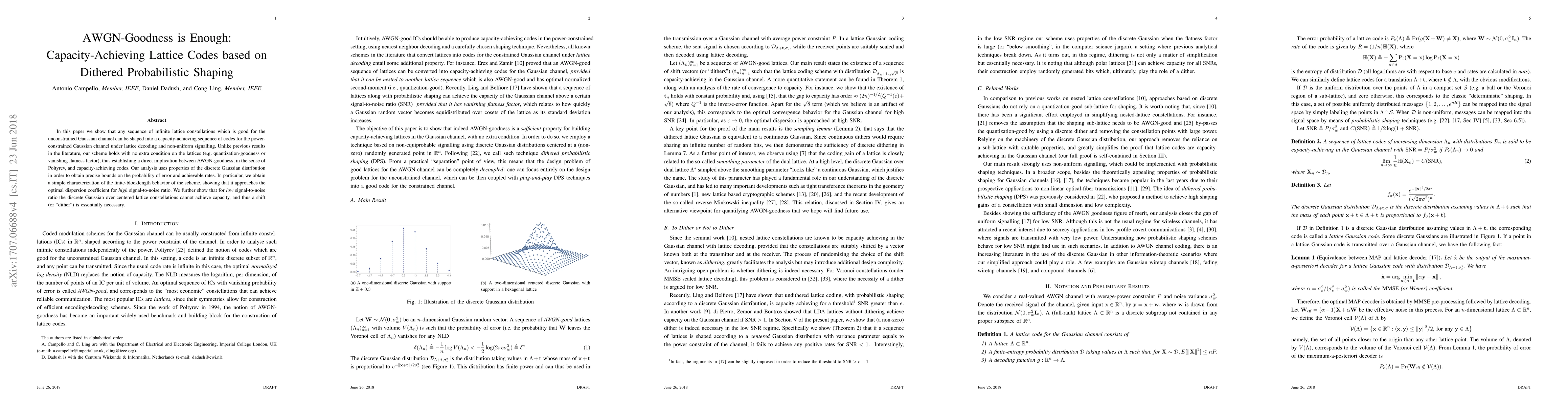 In this paper we show that any sequence of infinite lattice constellations which is good for the unconstrained Gaussian channel can be shaped into a capacity-achieving sequence of codes for the power-constrained Gaussian channel under lattice decoding and non-uniform signalling. Unlike previous results in the literature, our scheme holds with no extra condition on the lattices (e.g. quantization-goodness or vanishing flatness factor), thus establishing a direct implication between AWGN-goodness, in the sense of Poltyrev, and capacity-achieving codes. Our analysis uses properties of the discrete Gaussian distribution in order to obtain precise bounds on the probability of error and achievable rates. In particular, we obtain a simple characterization of the finite-blocklength behavior of the scheme, showing that it approaches the optimal dispersion coefficient for \textit{high} signal-to-noise ratio. We further show that for \textit{low} signal-to-noise ratio the discrete Gaussian over centered lattice constellations can not achieve capacity, and thus a shift (or "dither") is essentially necessary.